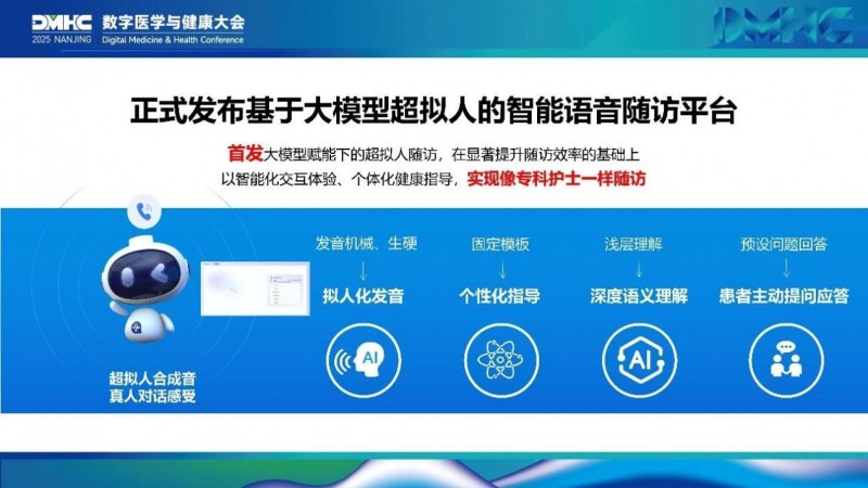 大会上,基于大模型的超拟人智能语音随访平台正式发布。该平台突破传统随访局限,其超拟人合成音技术带来真人对话般的自然体验,依托大模型的深度语义理解支持患者主动问答与智能应答,打破预设问题回答的局限,实现更精准的交互,可为患者提供动态个性化健康指导,标志着智能语音随访技术从功能化向拟人化的重要跨越。