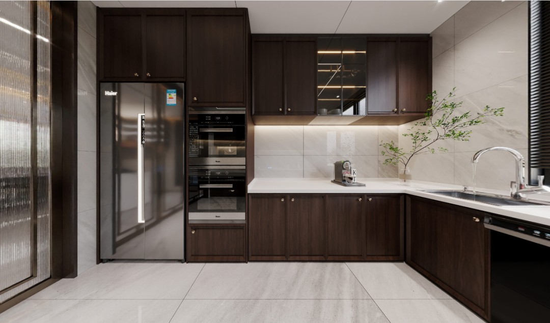 厨房采用U字型布局,打造了高效的洄游动线,使烹饪过程更加便捷。灶台区域特别设计了灯带照明,为做饭提供了充足的光线。