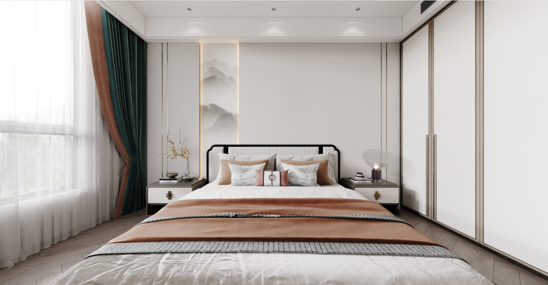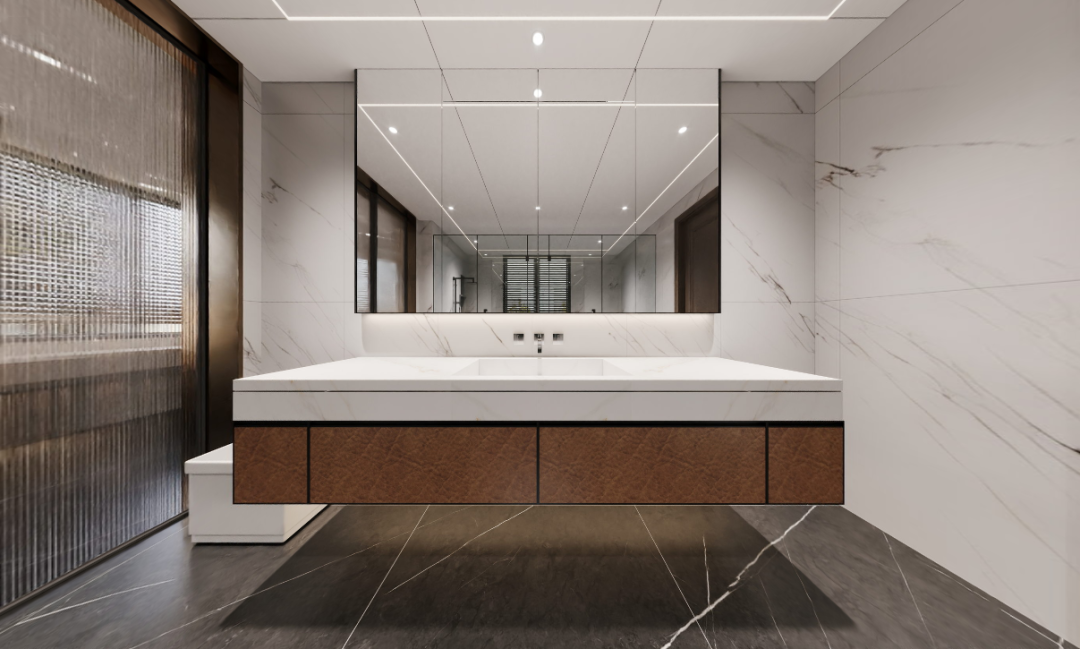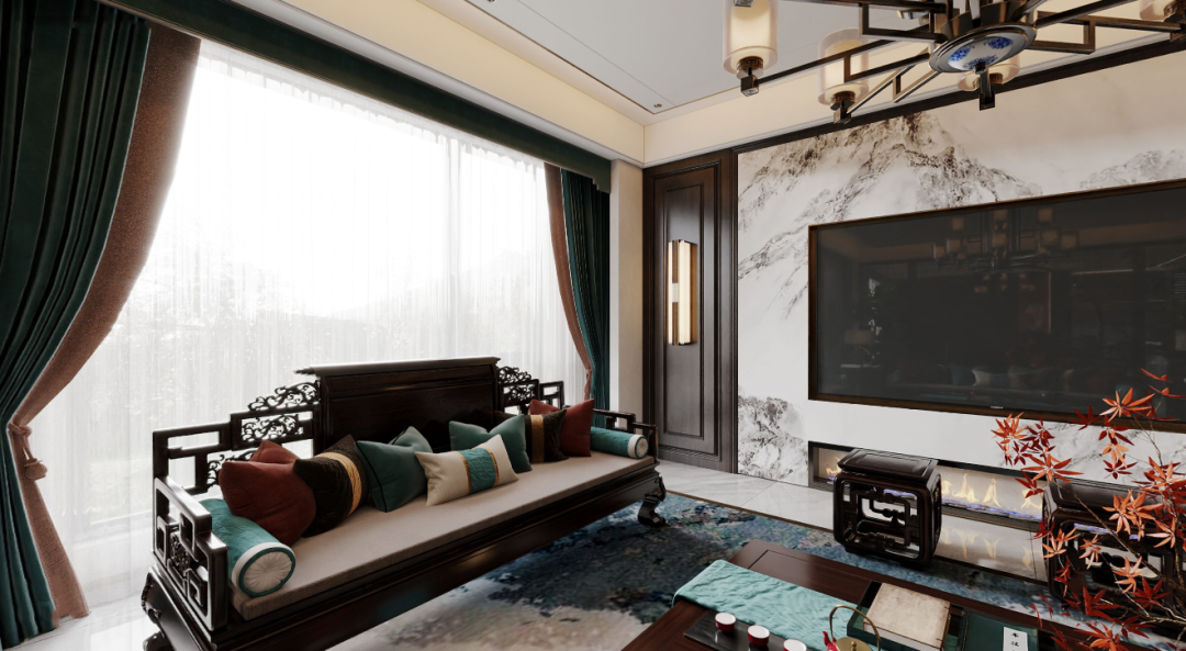 电视背景墙采用了岩板材质,宛如一幅生动的水墨山水画,层峦叠嶂,邀人穿越时空,缓缓走入山水之间,体验东方自然的宁静与和谐。