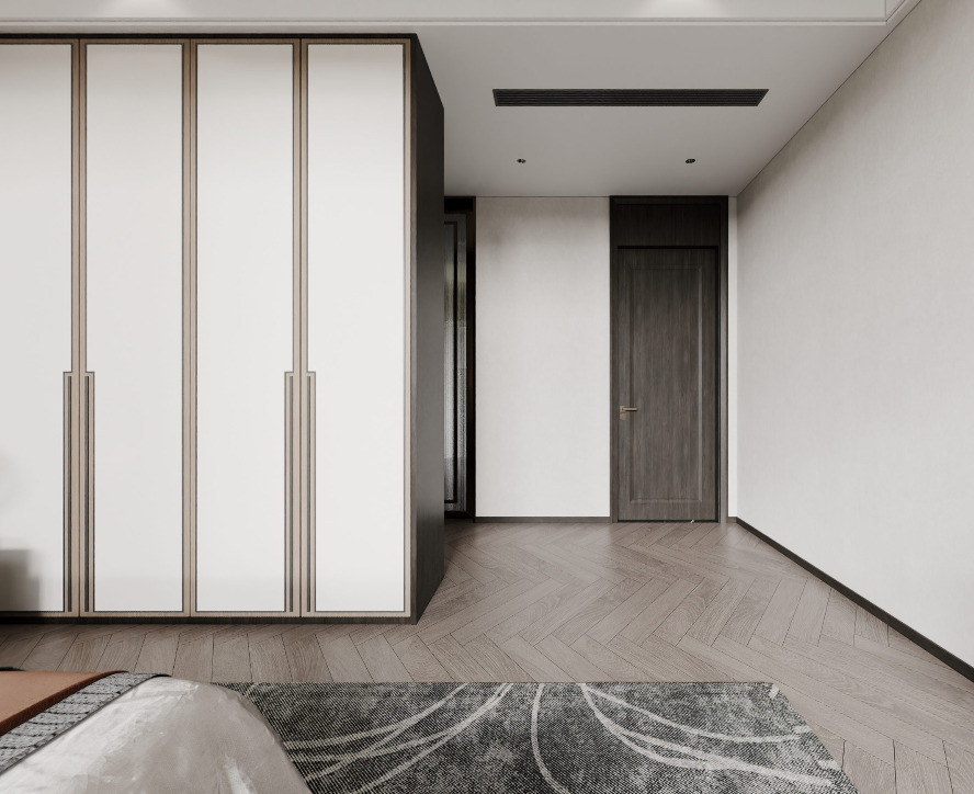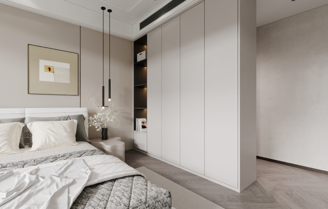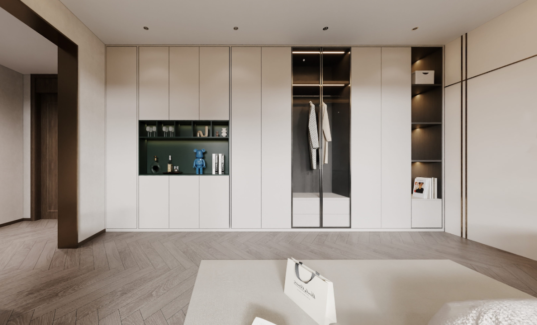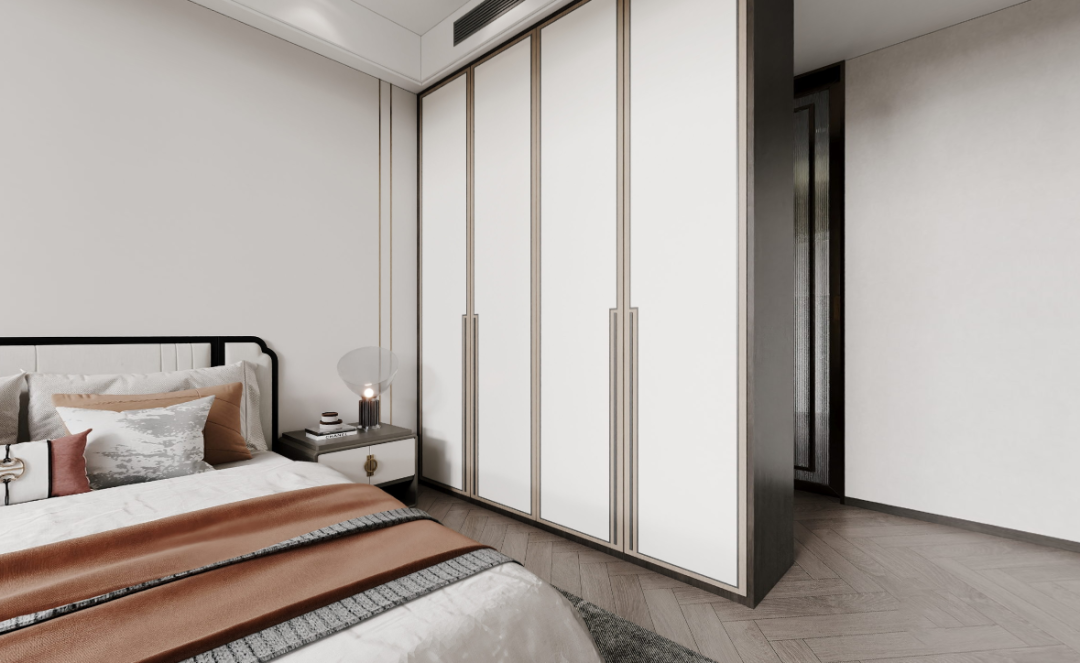 房内配备了独立的衣帽间和卫生间,确保了高度的居住舒适性和功能性。三分离的布局以及简洁明快的配色,彰显出硬朗而大气的气质。