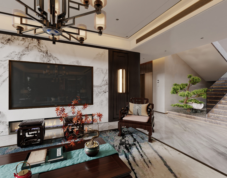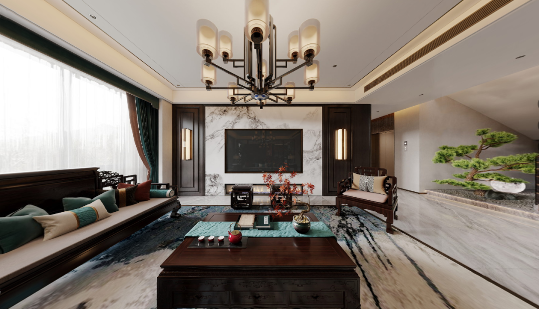 无主灯作为主要照明,错落有致地散布于空间之中;中式吊灯则以其独特的造型,成为空间的装饰物。光影交错,虚实相生,极富层次趣味,让人深刻感受到艺术之美。