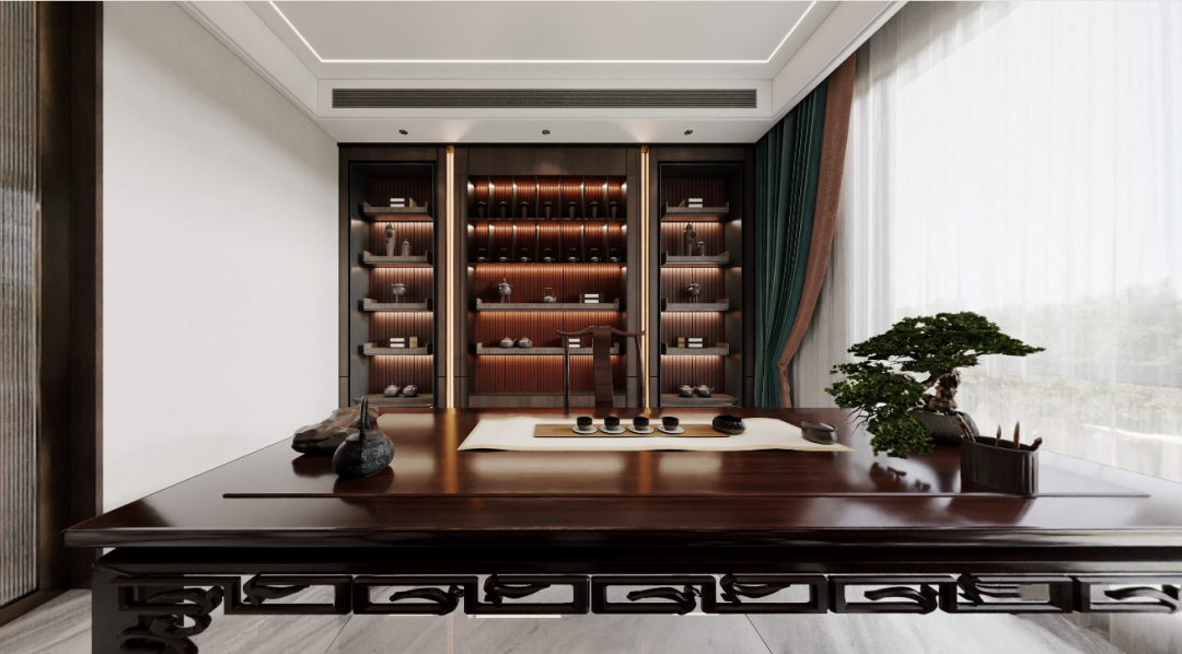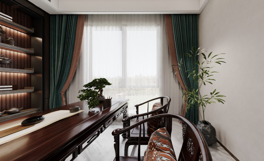 茶室,以红木家具和深木色酿造出细腻温柔、雅正平和的氛围。配以中式的茶壶、书籍、摆件、挂画,丰盈了这份古典的况味。