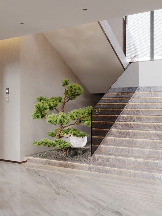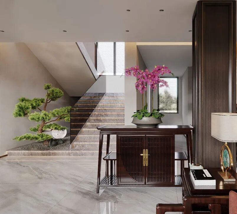 楼梯空间亦兼具审美意趣,山石与苍松在月光灯的笼罩下映出婆娑疏影,诠释着空静深微的禅宗美学。