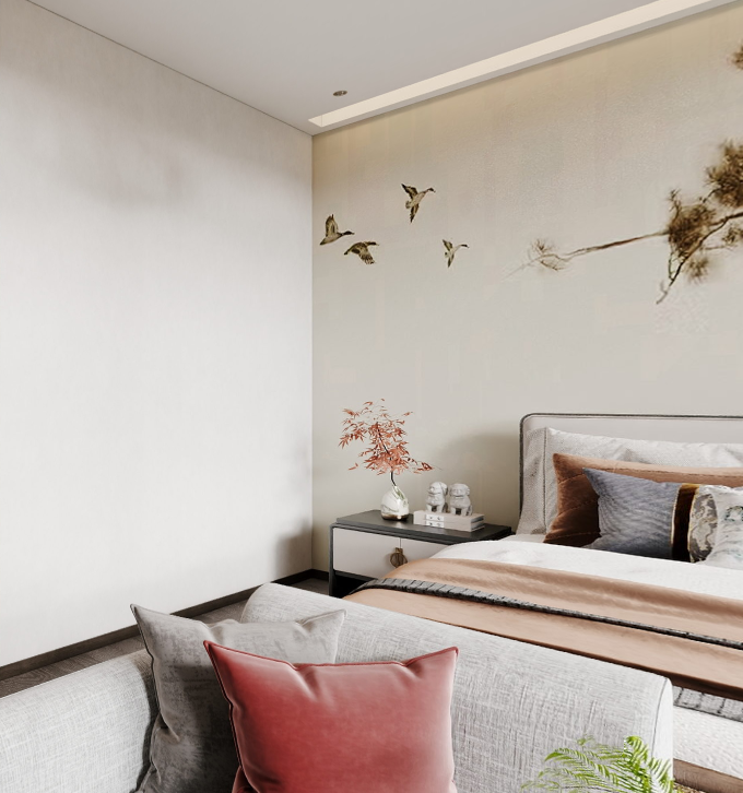 二楼主卧套房,是业主夫妻的私密空间。设计以清浅淡雅的传统缟白/浅灰为主调,同时点缀以墨色、朱红、雅灰、湛蓝几种古韵色调,古雅秀逸的气质自空间的细节中悄然生发,意境悠远,一室清华。