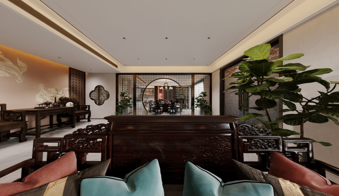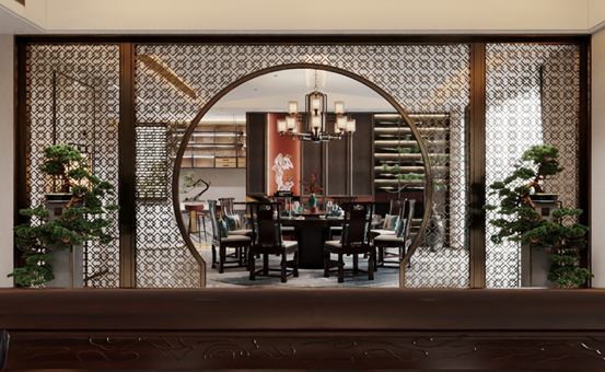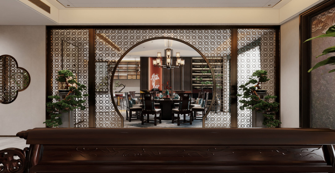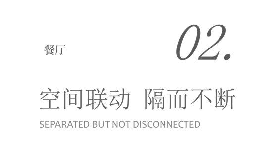 以月牙门相隔的客餐厅之间,形成视觉的联动。隔而不断,是典型的东方审美,作为一种含蓄的呈现方式。镂空设计通过对隔与透、藏与漏、虚与实恰到好处地掌控,让空间聚合的同时又富有连续性,将东方的情怀缱绻其中。