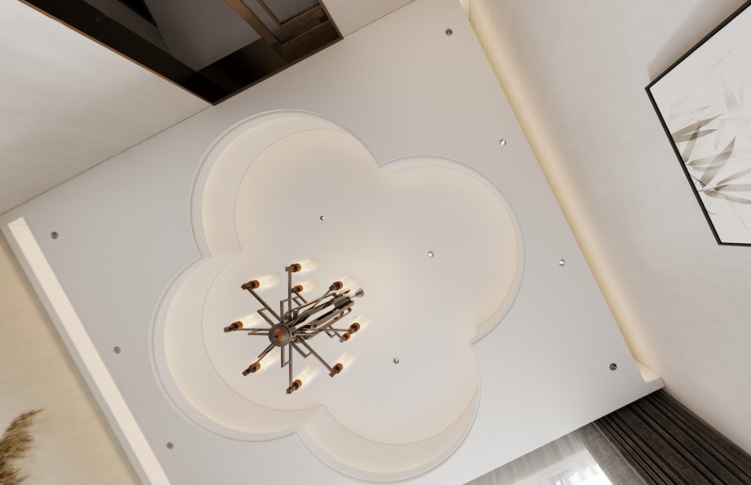 吊顶设计,别出心裁,用经典的海棠花造型致敬东方美学,将古典的诗意氛围蔓延至每一个角落,成为整个空间的亮点。