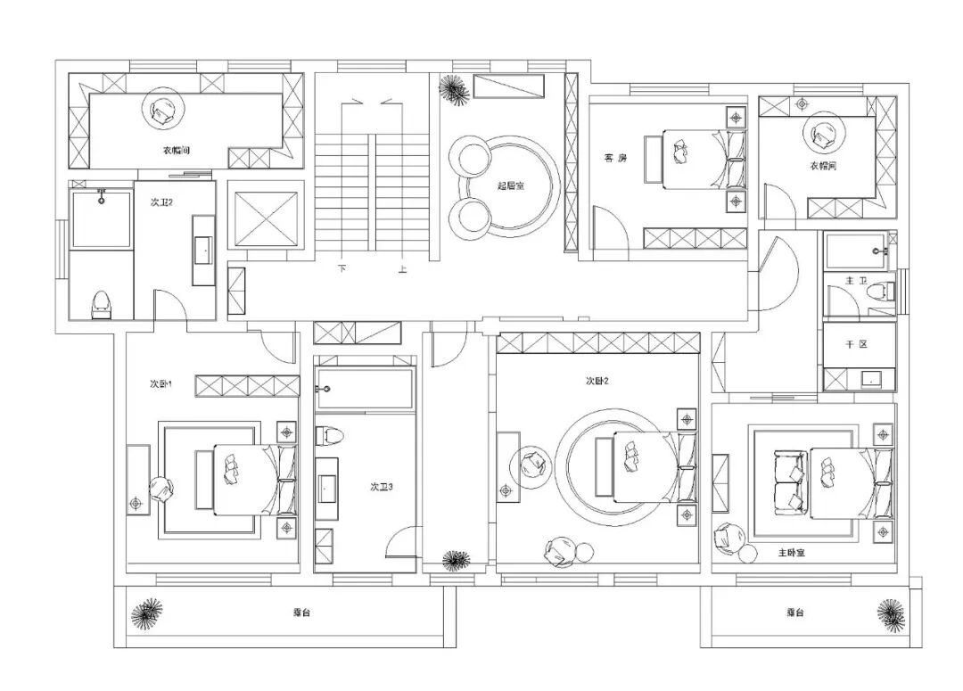 ②二楼根据业主一家的居住需求,规划了3间套房、1间客房和1间起居室,功能配置十分齐全,动线流畅,同时兼具私密性。