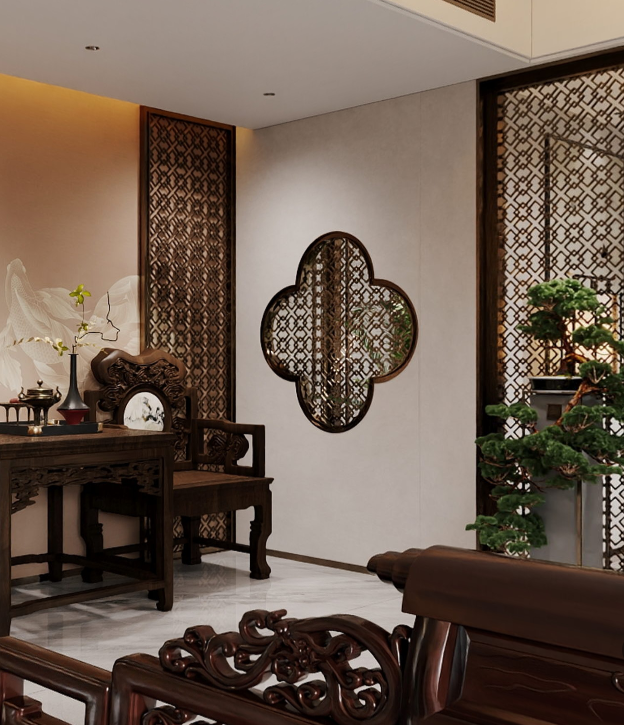推开大门,一幅“锦鲤双嬉图”映入眼帘,传达出灵动和谐的自然意趣,寓意富贵吉祥。红木家具对称摆放其间,为空间增添了一份庄重、大气,彰显了东方美学的典雅与尊贵。