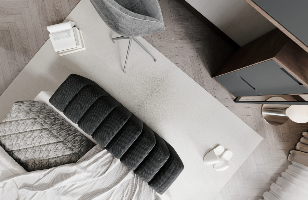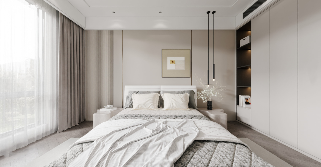 另一个孙辈房间,同样以黑白灰为主调,构建干净、雅致的空间气质,辅以温润柔和的材质质地、简洁凝练的线性关系,营造出静谧优雅且舒适的睡眠氛围。