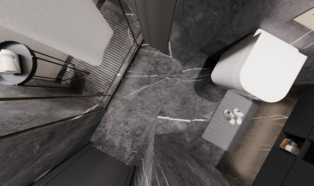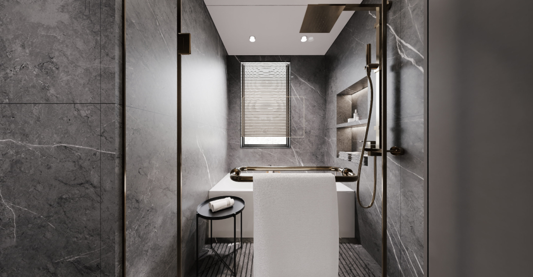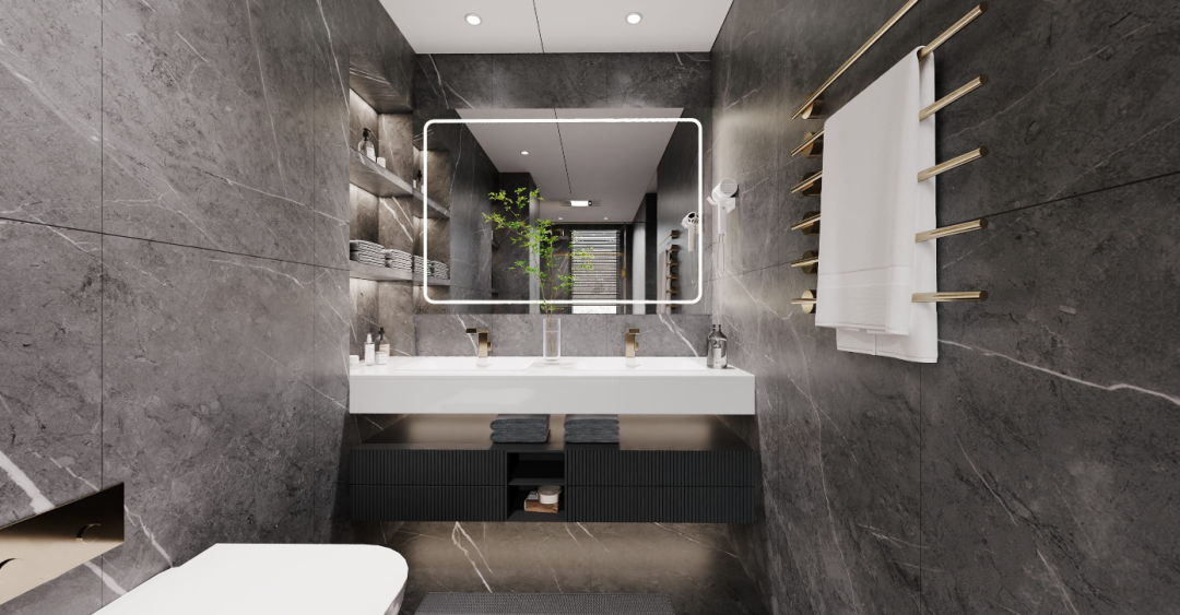 卫生间的材质也更多采用了黑白对比的方式,不同的材质会体现不同的感受,洁净的白,素雅的灰,沉着的黑,加以轻奢的五金点缀,尽显高级质感。