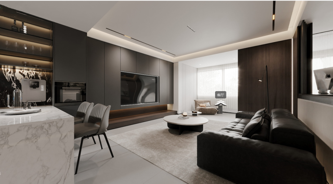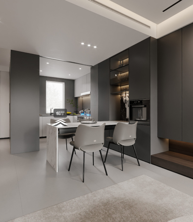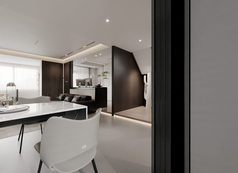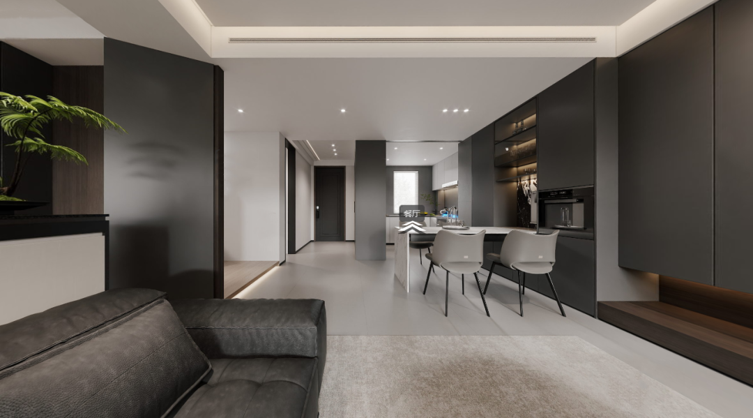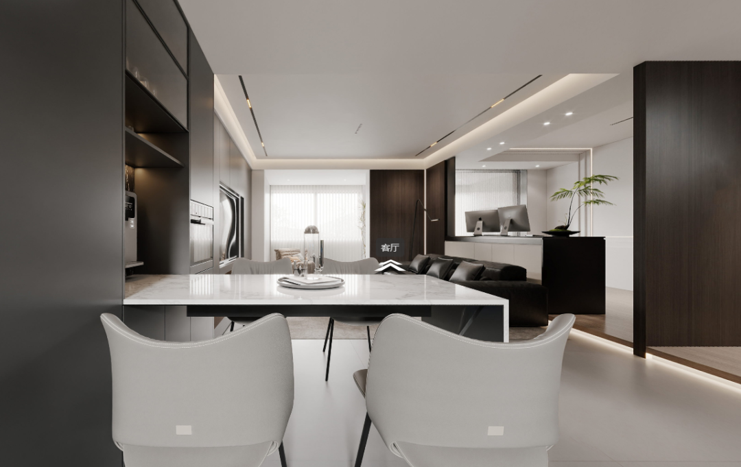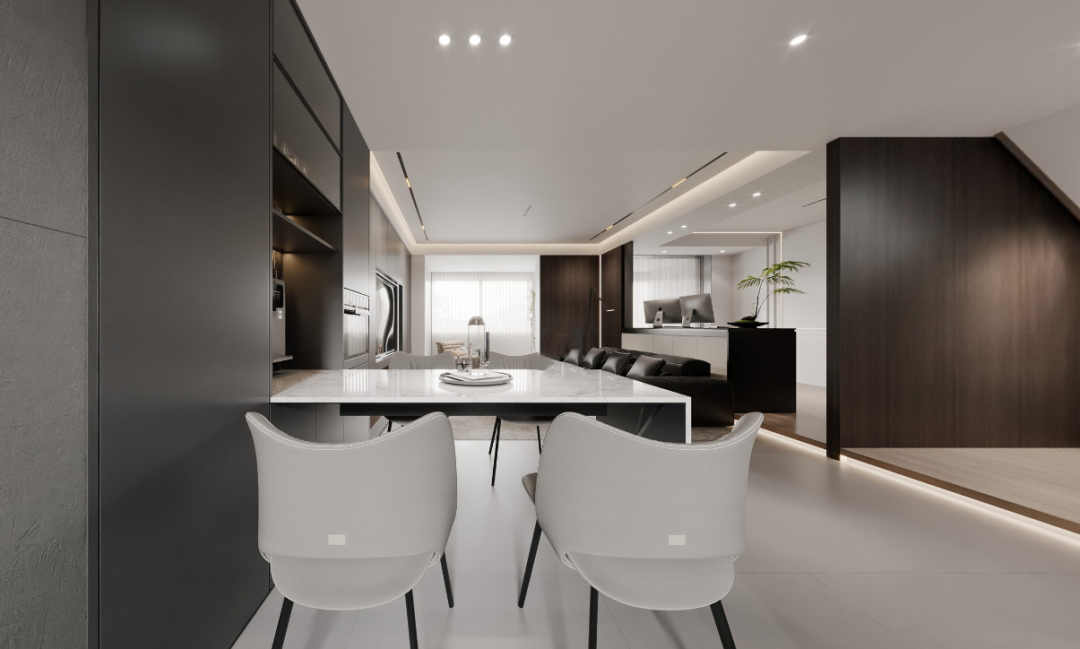 从客厅眺望餐厅,灰黑深邃诱人,白色点缀其间,深浅在光影交织下展现出极致的纯净。#清水江南别墅整装#