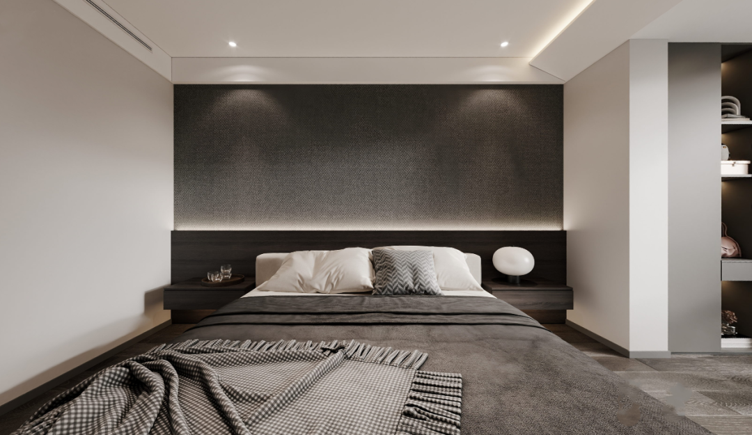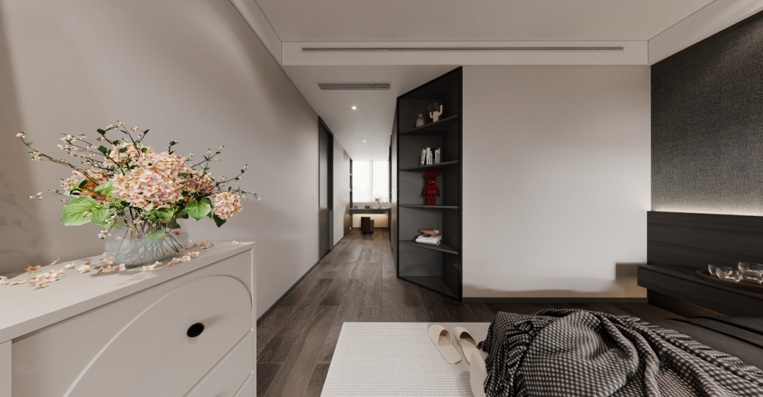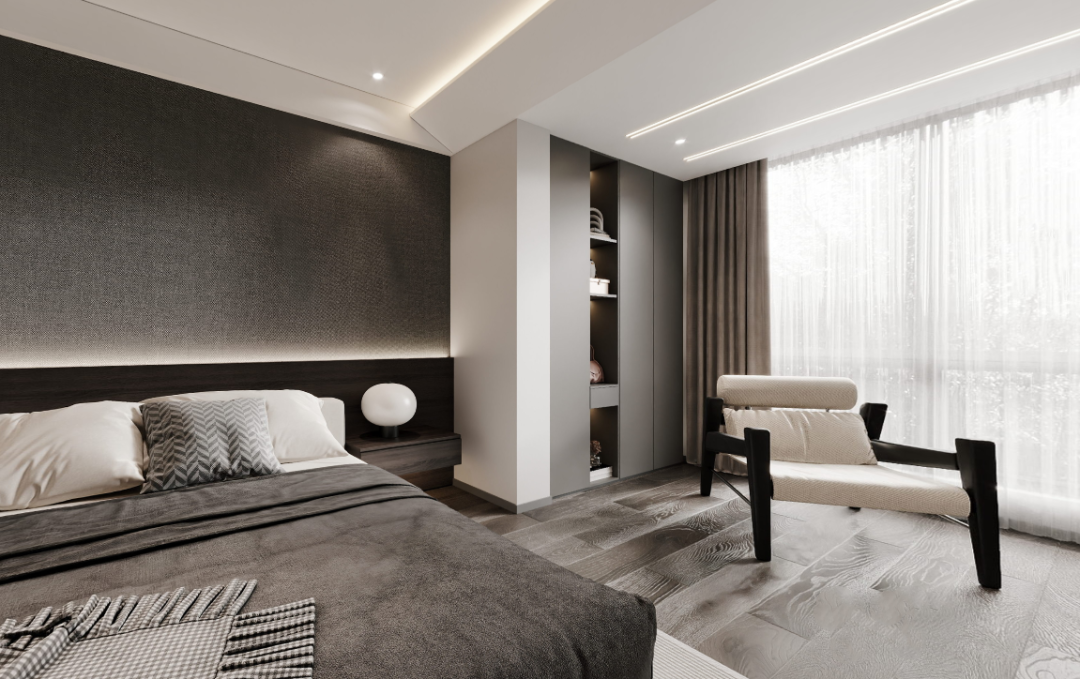 主卧套房,回归自我的纯粹,让人从忙碌的生活里获得短暂的逃离。灯带与线条的结合,凝练出几何的优雅灵动与组合变化,以细节打破空间的单调。简约素雅的黑白灰是空间的底色,营造出更加宁静与舒缓的氛围 ,让心不自觉也变得温柔起来。