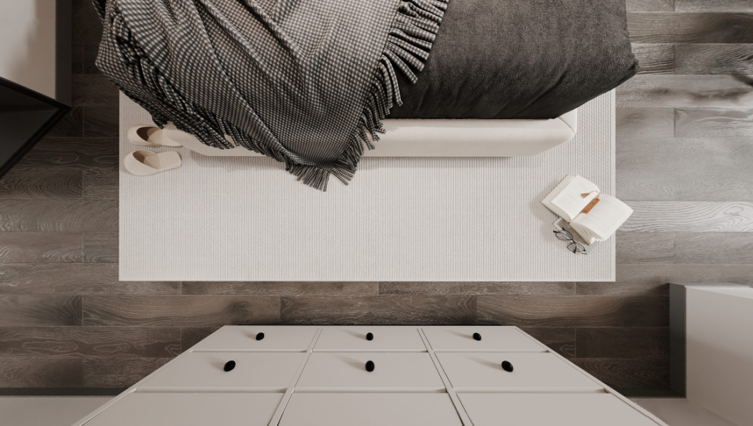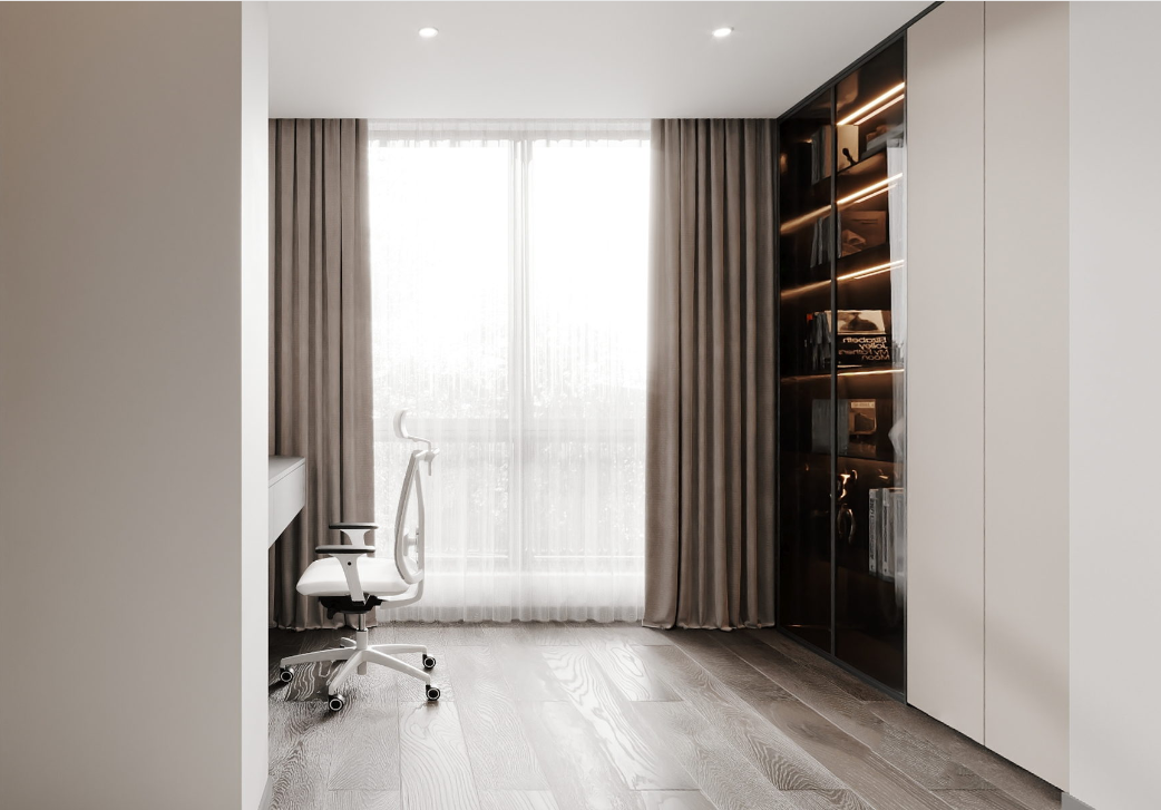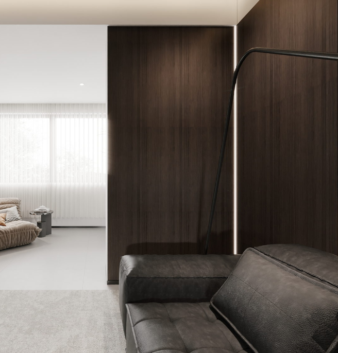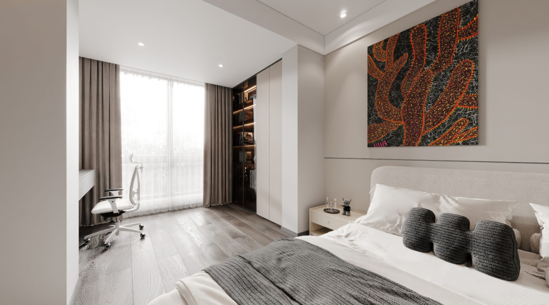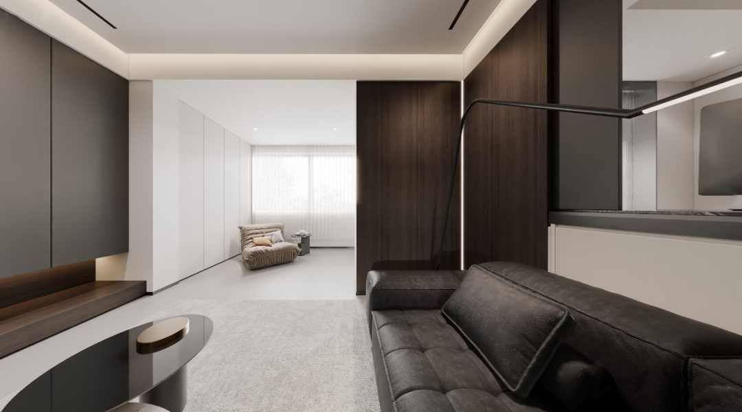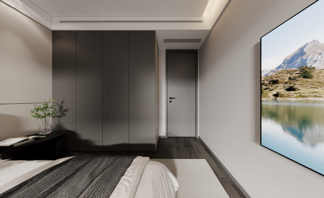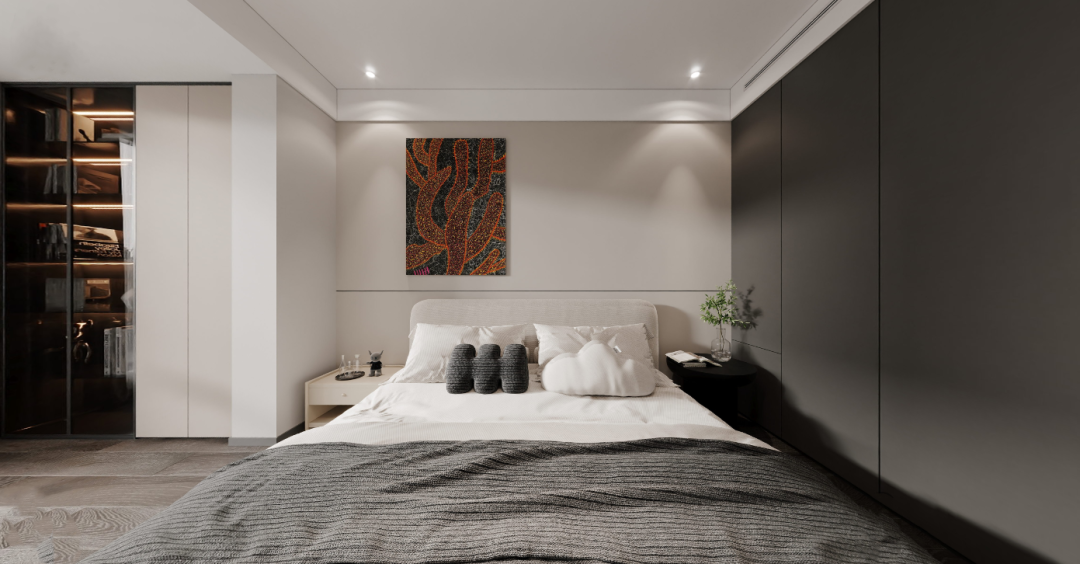 行至次卧,豁然开朗。暖白木饰面与暖调灯光交错,创造温暖的感知。明亮的空间与外部形成反差,深色的柜体又带来一丝稳重,形成一种微妙的平衡。