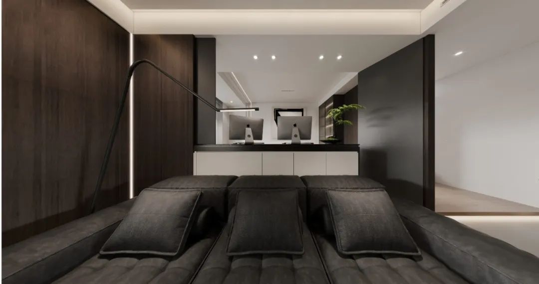 这个角落的L型护墙板,与地台上的隐形门相连,极大强化了空间的整体感。而线性灯的引入,不止打破了深色饰面的沉闷感,还照亮了角落,为整个空间注入了活力。