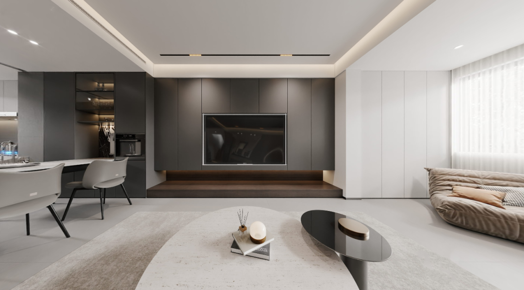 木色电视柜的加入,形成深色与浅色的叠加,丰富了空间的层次和视觉语言。