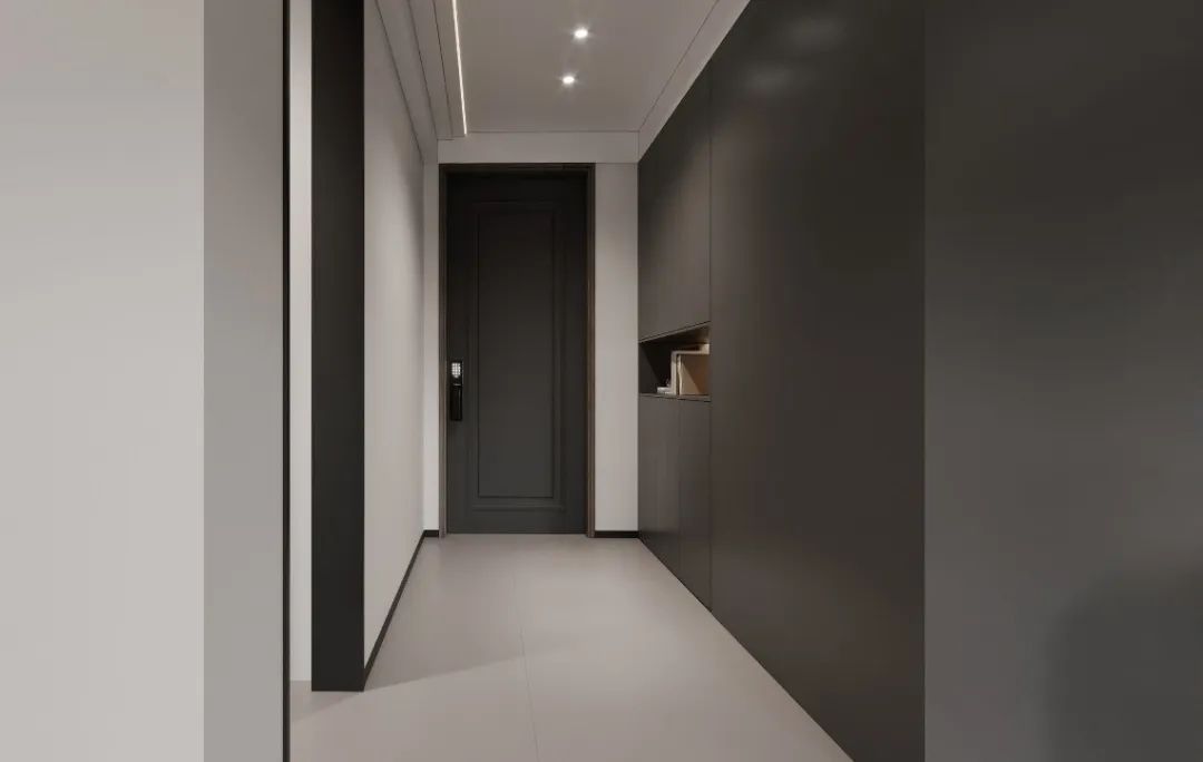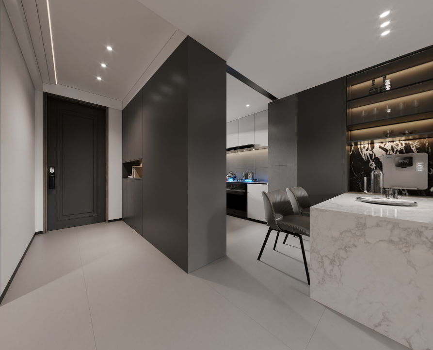 世界在黑白之间,喧嚣在指尖之外。本案从入户开始,就由高级灰设计引领入内,营造宁静深邃的第一印象,让归家之路充满仪式与期待;双面柜的设计,打破户型局限,朝外是门厅衣帽柜,朝内是厨房冰箱位置,一举两得。