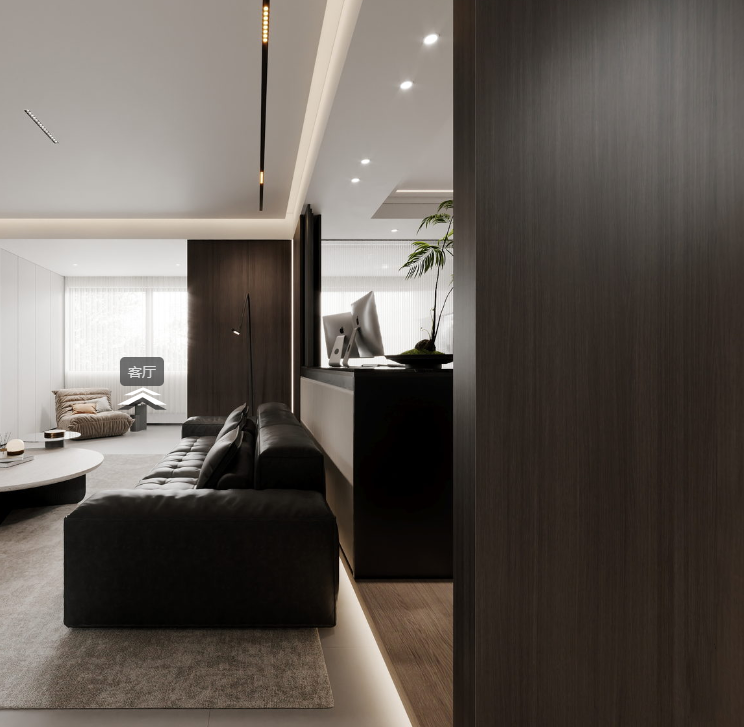 黑色/高级灰作为空间的主角,将自身气质毫无保留地赠予空间,神秘,深邃,夜一般的深沉。星点的浅木色、白色突出重围,用温润中和黑灰的冷冽,以轻盈过渡黑灰的深沉,层层递进,干净利落,现代艺术的张力跃然其间。