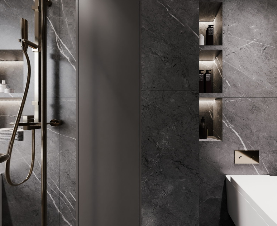 壁龛、储物柜的设置既为实用,亦具装饰。巧妙化解结构中存在的水管,又多了收纳展示功能,让卫生间丰富了起来。