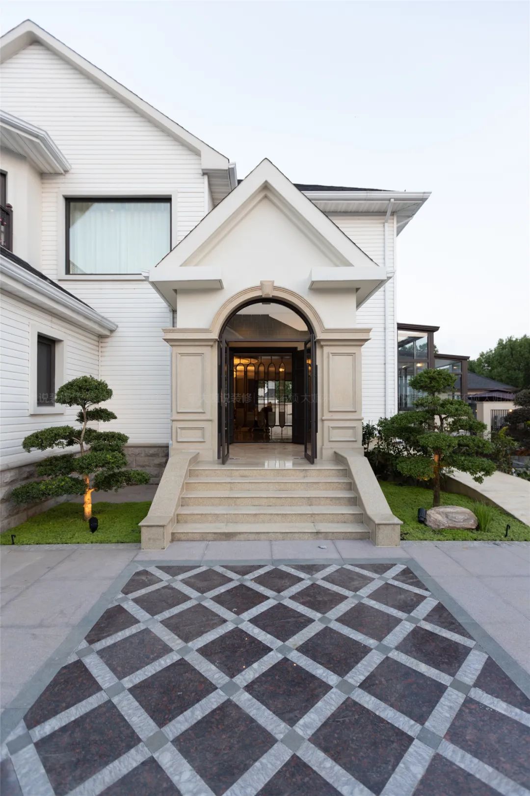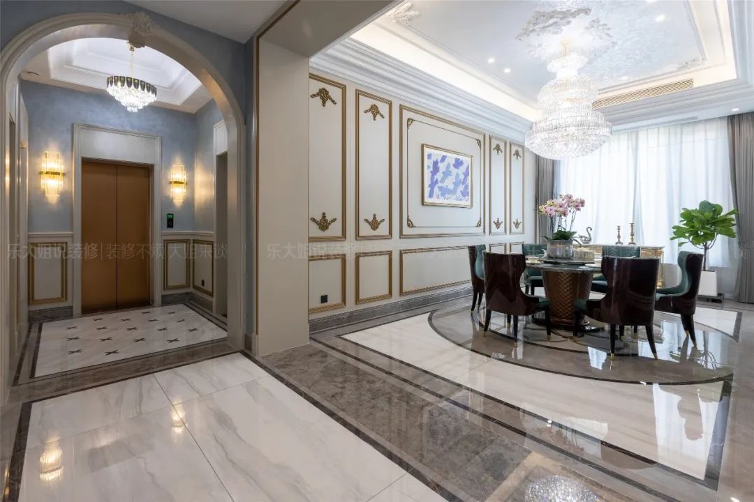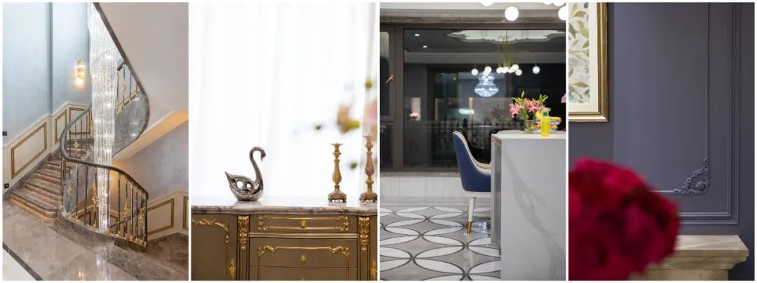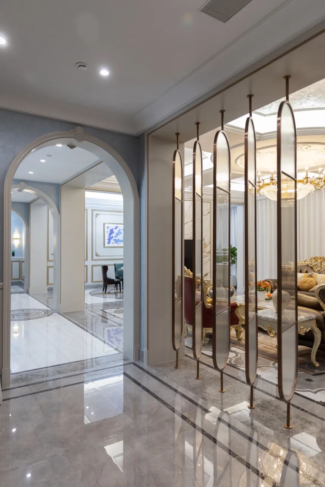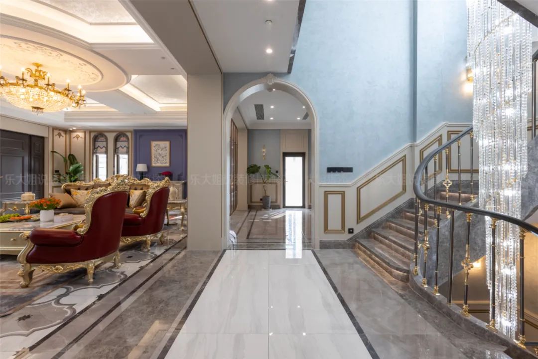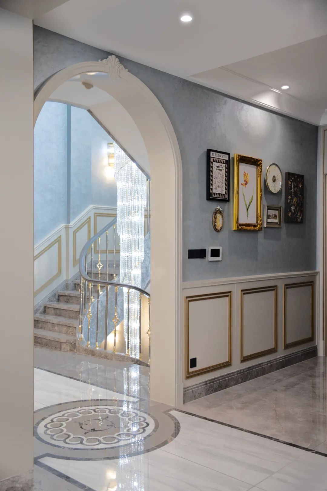 说:“银丽高尔夫这套独栋别墅含阁楼室内面积近1000平,庭院700多平,楼上的露台花园可以看到阳澄湖景,还可以把工业园区的景色尽收眼底,不愧为庄园式的别墅。本案室内设计一反常规的单一风格,采取了美式、欧式、法式的混搭,甚至还用到了些中式元素来满足心心念念喜欢中式风格的男业主。整体以浅色系为基底,加上莫兰迪色的点缀,并采用了大量的描金护墙板、大理石、拱门等经典元素,最终呈现出豪而不俗的大宅气派,大大超越了业主一家人对于豪宅的向往。”