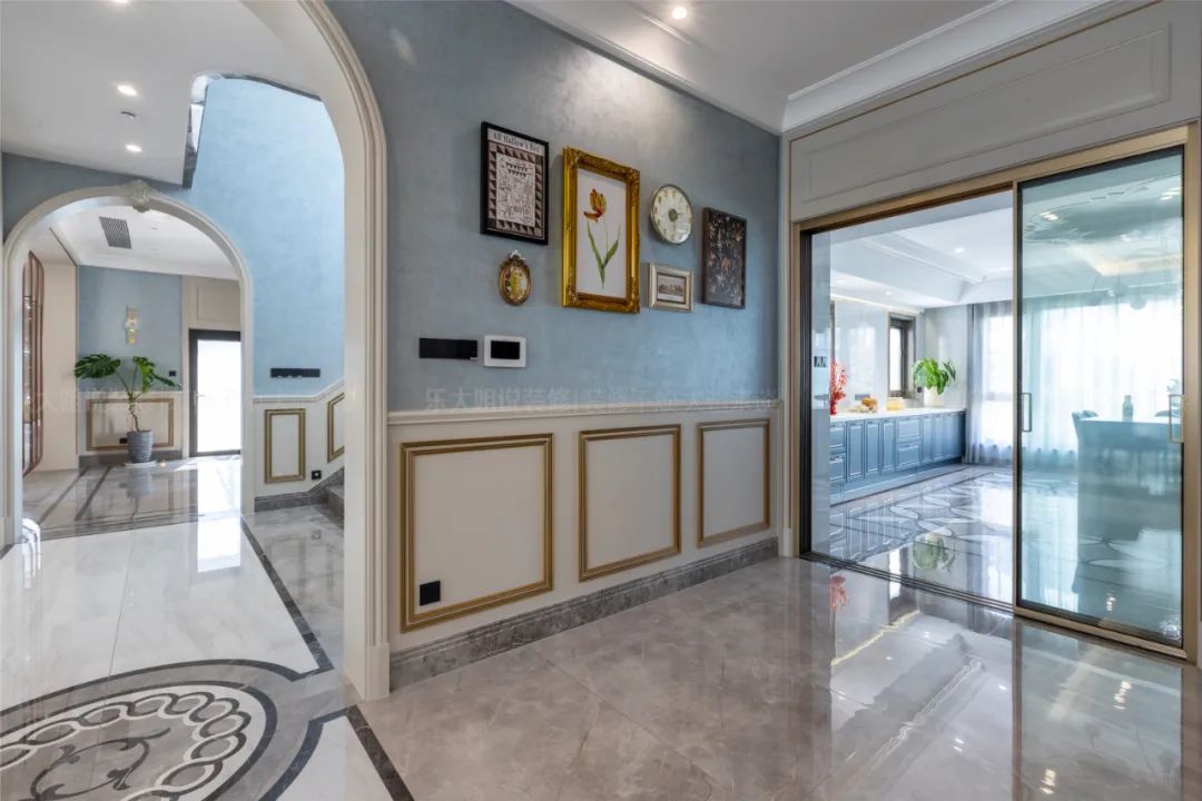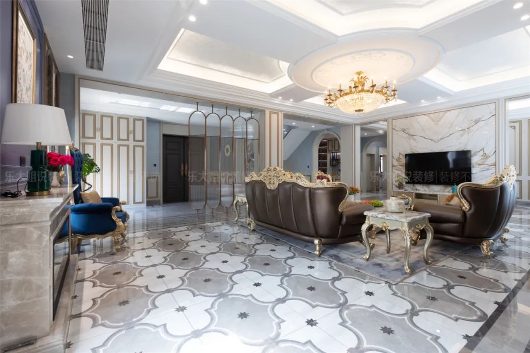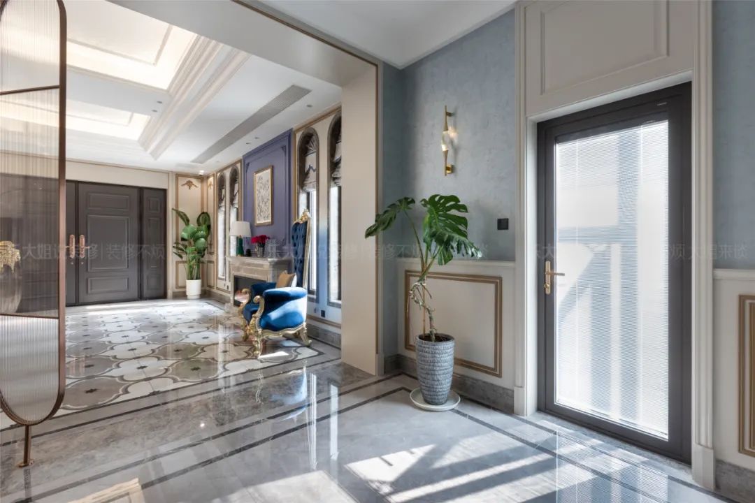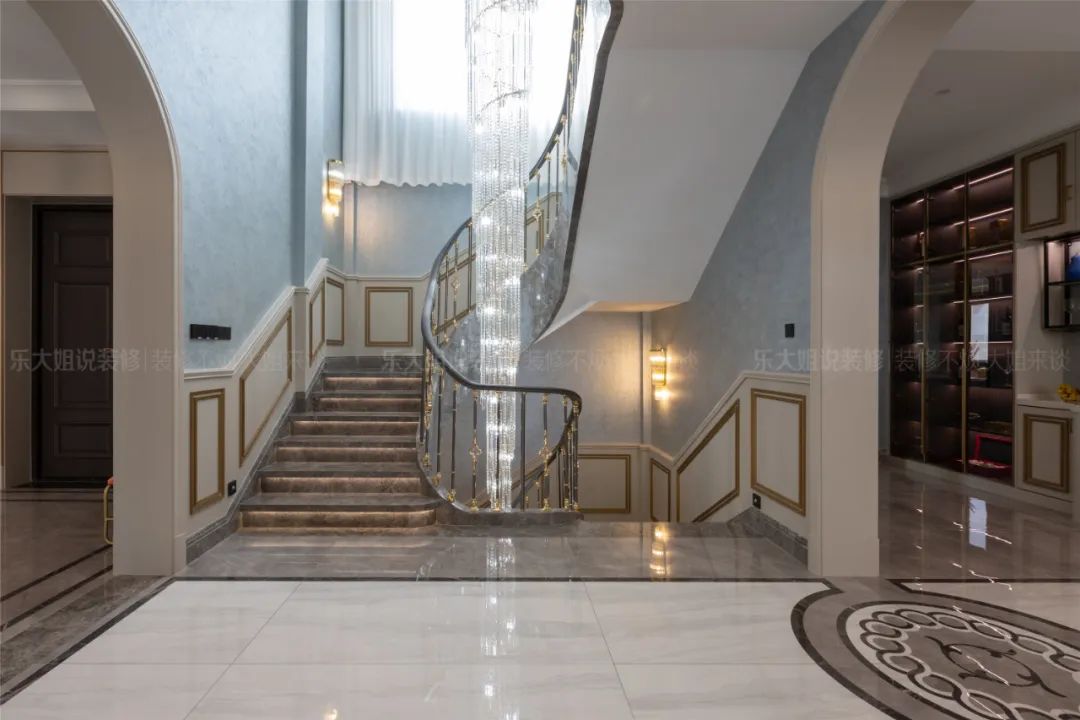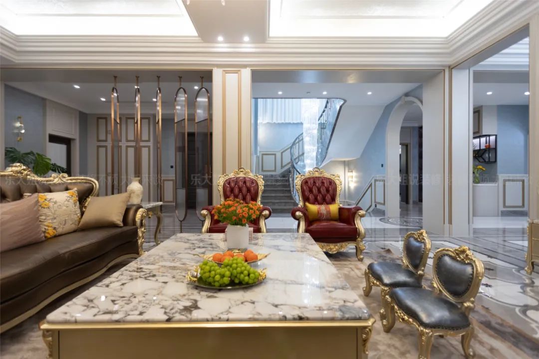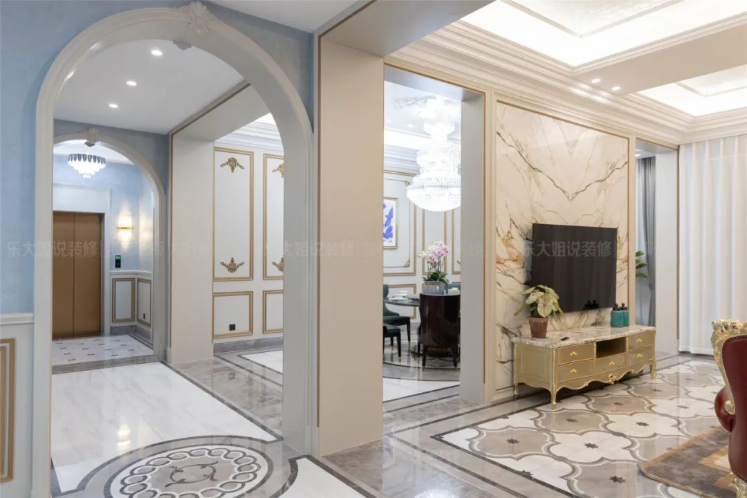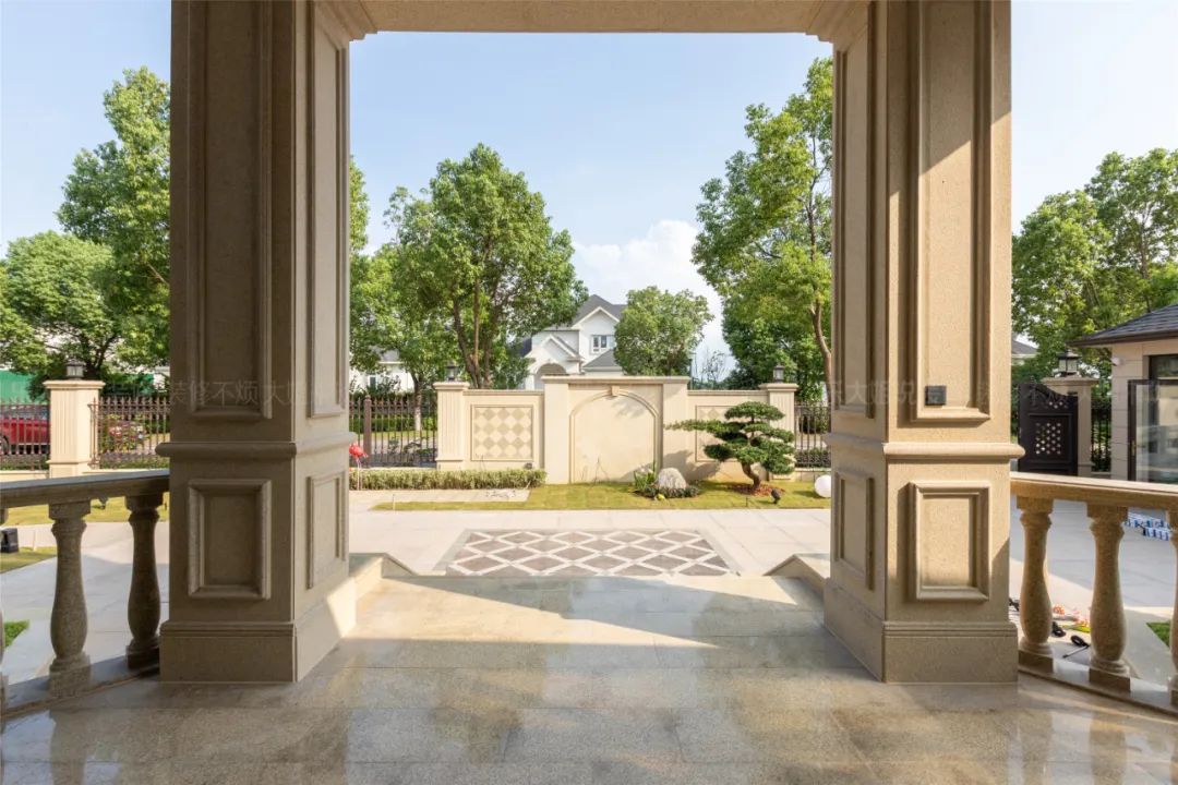 说:“银丽高尔夫这套独栋别墅含阁楼室内面积近1000平,庭院700多平,楼上的露台花园可以看到阳澄湖景,还可以把工业园区的景色尽收眼底,不愧为庄园式的别墅。本案室内设计一反常规的单一风格,采取了美式、欧式、法式的混搭,甚至还用到了些中式元素来满足心心念念喜欢中式风格的男业主。整体以浅色系为基底,加上莫兰迪色的点缀,并采用了大量的描金护墙板、大理石、拱门等经典元素,最终呈现出豪而不俗的大宅气派,大大超越了业主一家人对于豪宅的向往。”