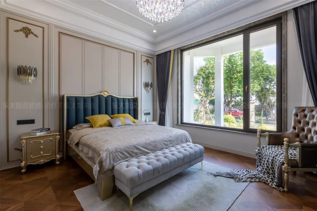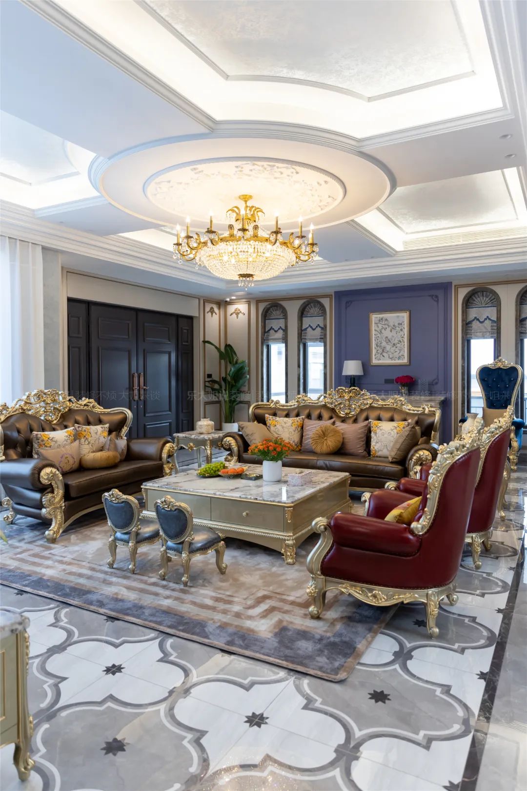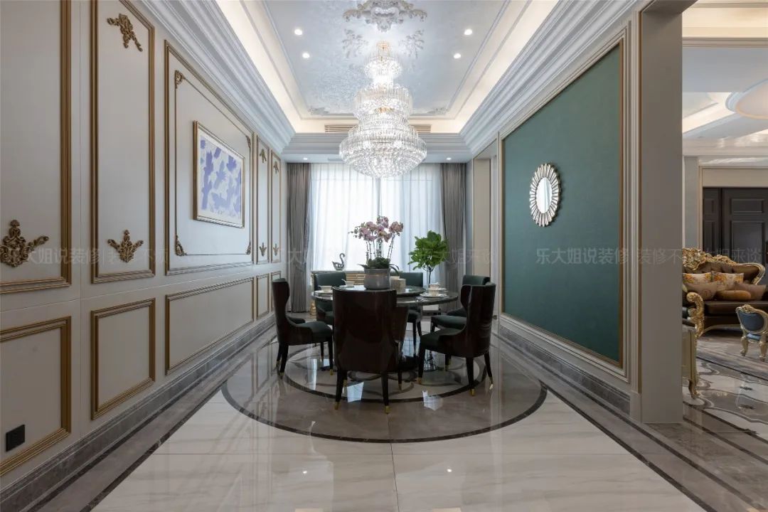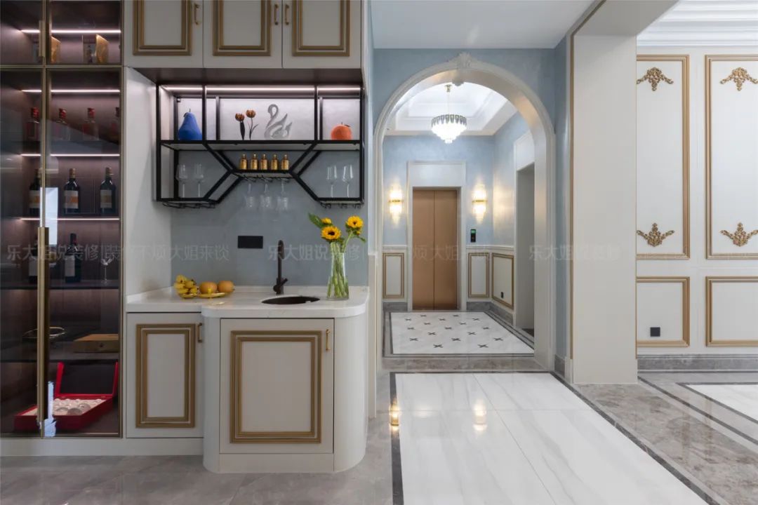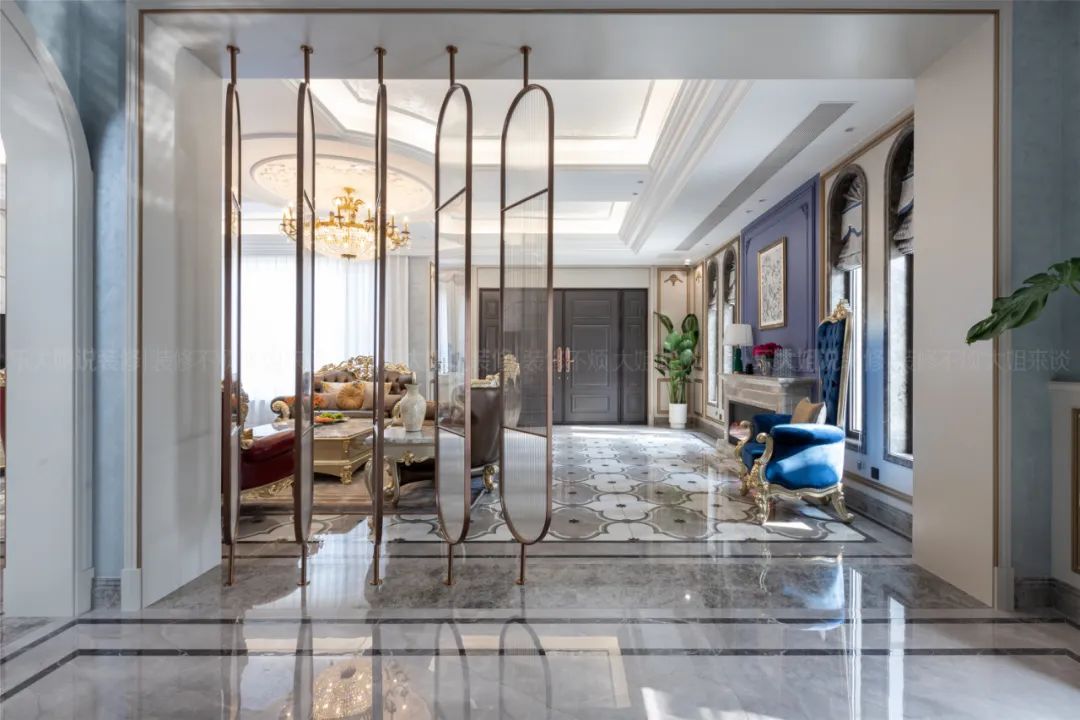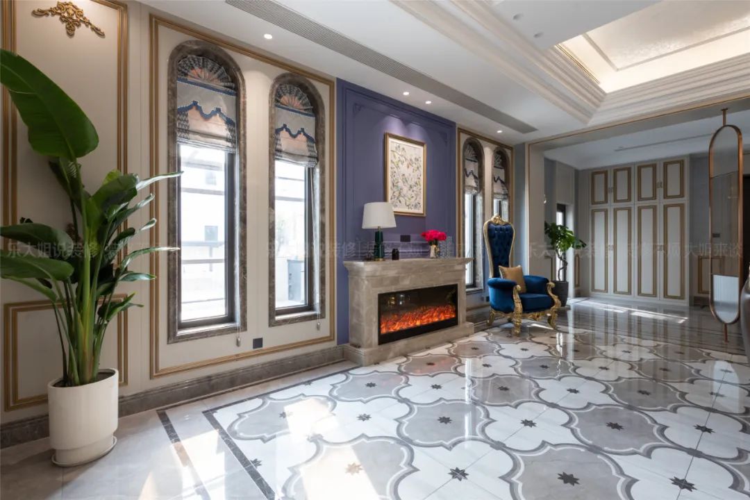 说:“银丽高尔夫这套独栋别墅含阁楼室内面积近1000平,庭院700多平,楼上的露台花园可以看到阳澄湖景,还可以把工业园区的景色尽收眼底,不愧为庄园式的别墅。本案室内设计一反常规的单一风格,采取了美式、欧式、法式的混搭,甚至还用到了些中式元素来满足心心念念喜欢中式风格的男业主。整体以浅色系为基底,加上莫兰迪色的点缀,并采用了大量的描金护墙板、大理石、拱门等经典元素,最终呈现出豪而不俗的大宅气派,大大超越了业主一家人对于豪宅的向往。”
