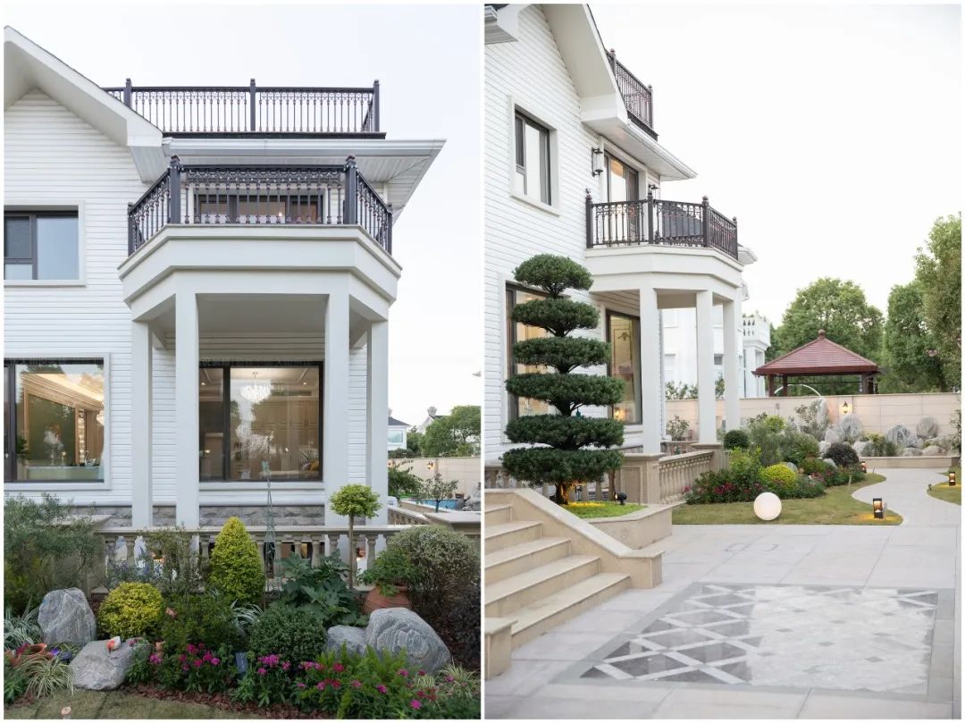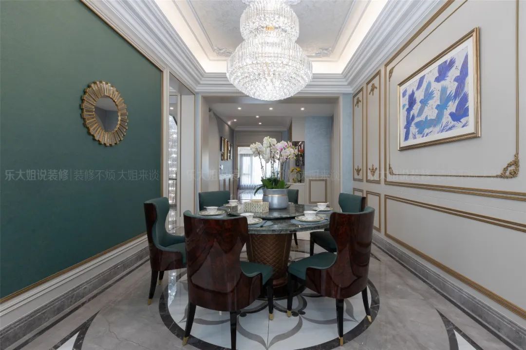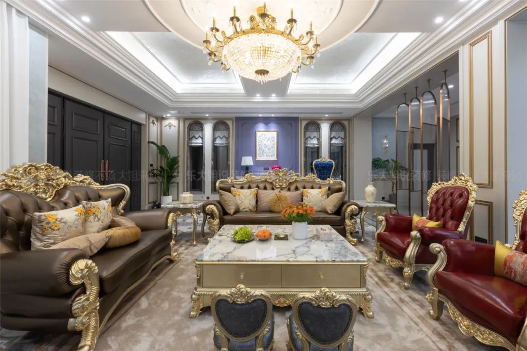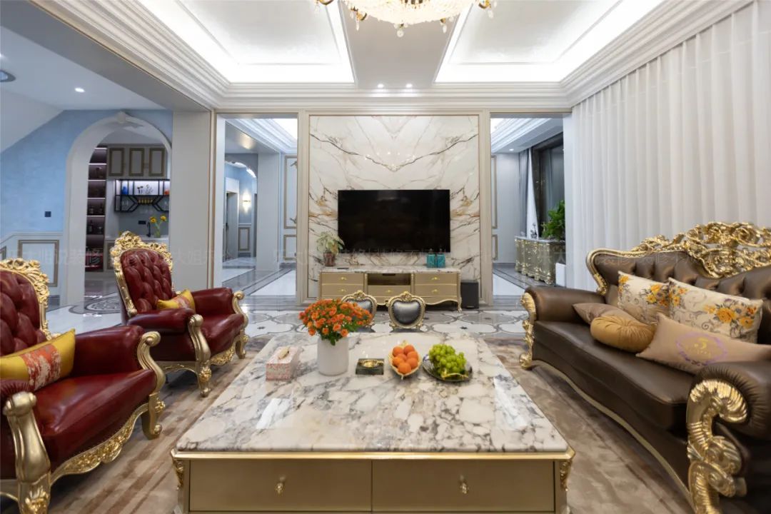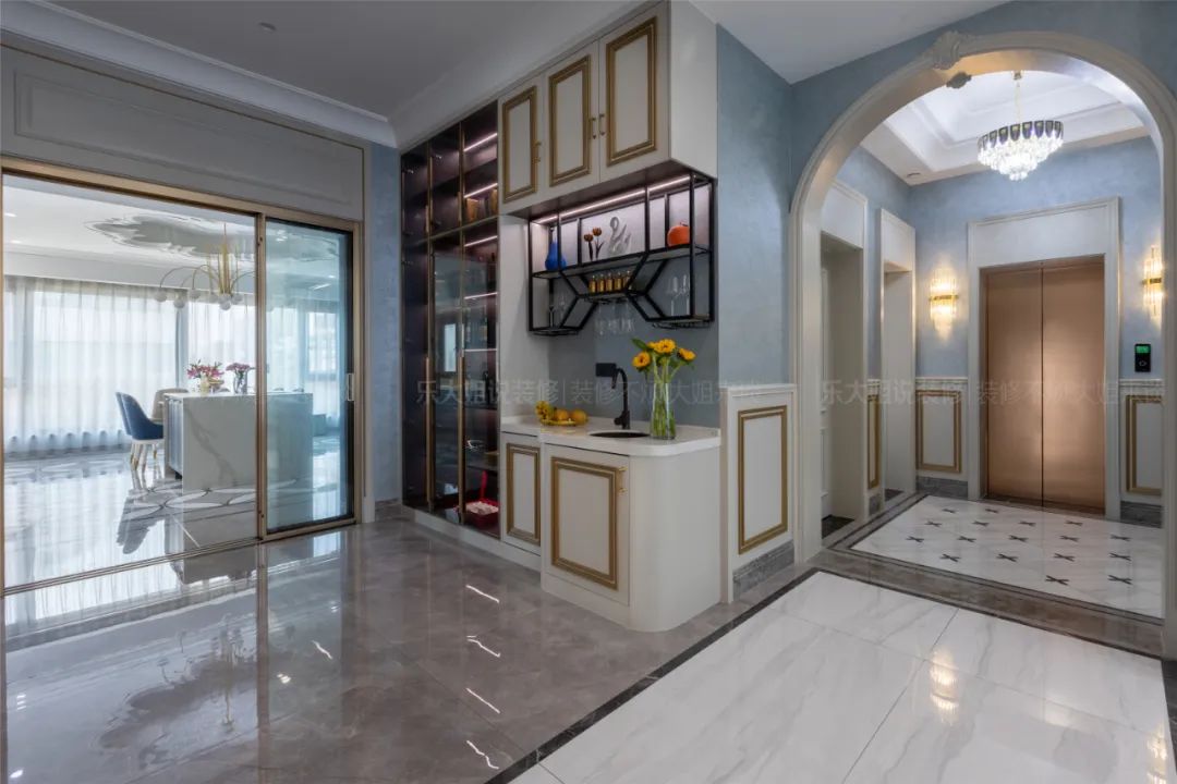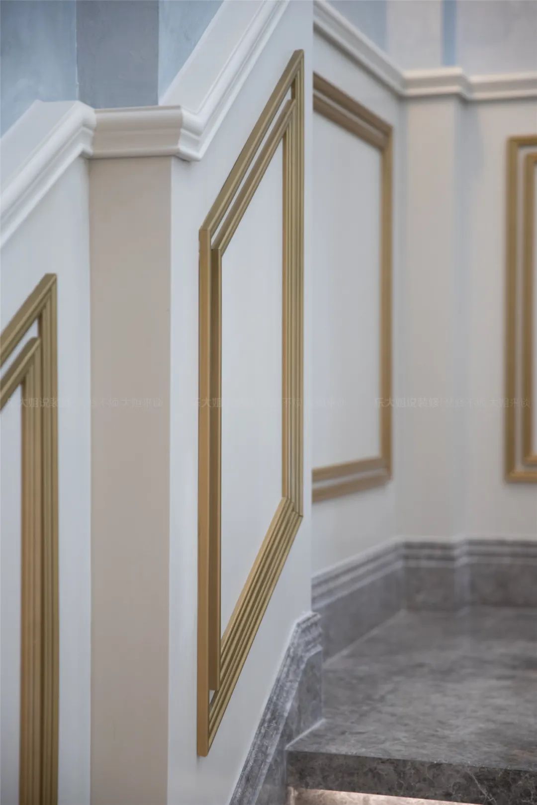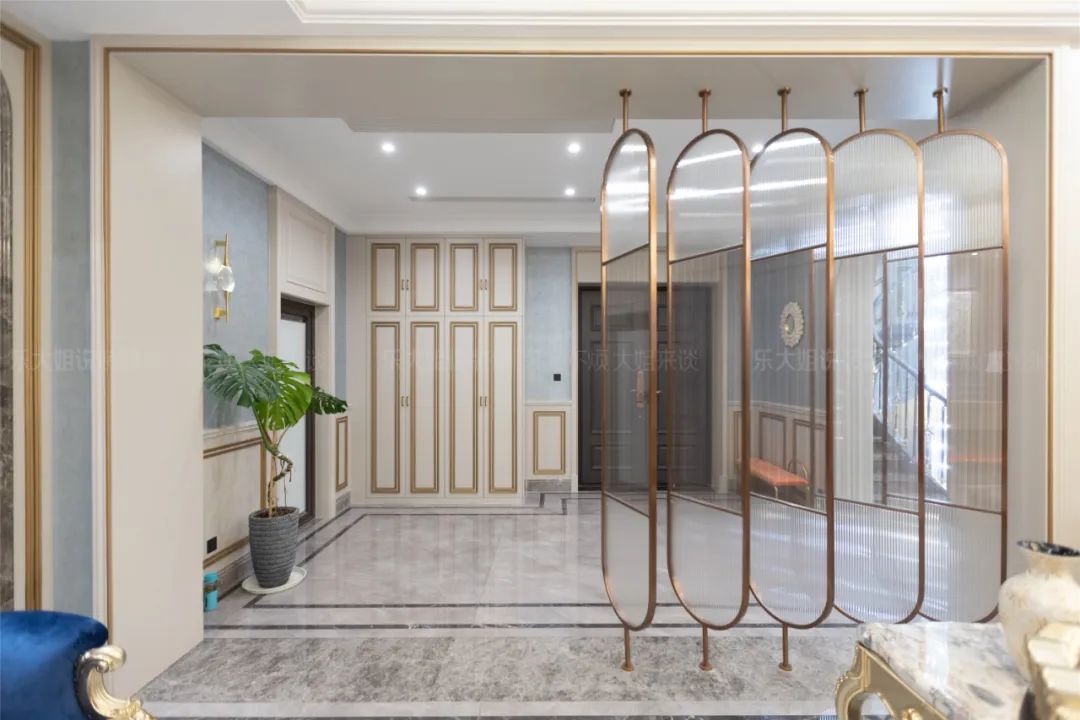 说:“银丽高尔夫这套独栋别墅含阁楼室内面积近1000平,庭院700多平,楼上的露台花园可以看到阳澄湖景,还可以把工业园区的景色尽收眼底,不愧为庄园式的别墅。本案室内设计一反常规的单一风格,采取了美式、欧式、法式的混搭,甚至还用到了些中式元素来满足心心念念喜欢中式风格的男业主。整体以浅色系为基底,加上莫兰迪色的点缀,并采用了大量的描金护墙板、大理石、拱门等经典元素,最终呈现出豪而不俗的大宅气派,大大超越了业主一家人对于豪宅的向往。”