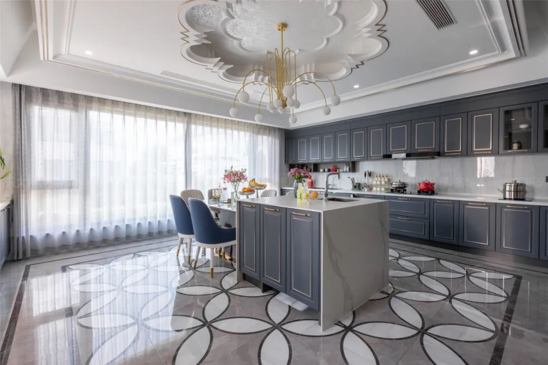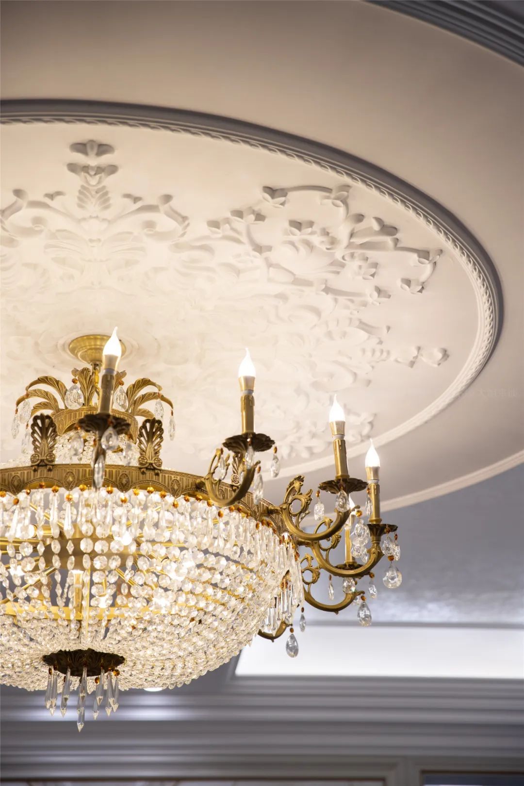 金色的花瓣形吊顶,将美学的感性与空间的质感做了最完美的平衡,非常有艺术感,创造出轻奢化的法式浪漫。