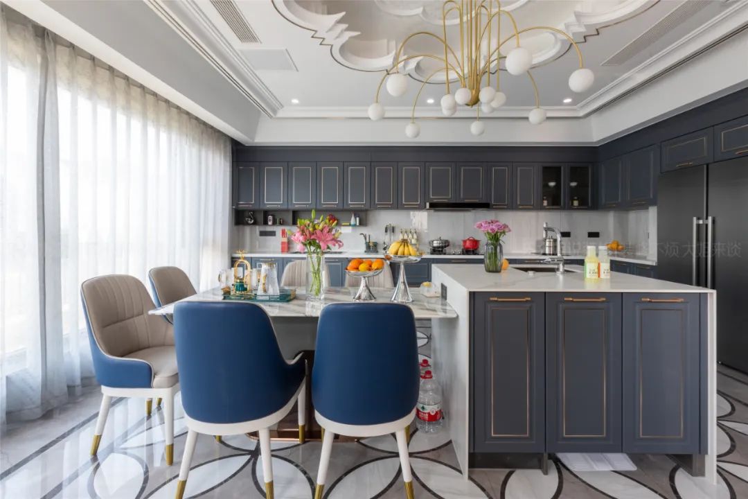厨房面积足够大,除了常规橱柜、高柜的设置外,还加入了小餐厅的设计——岛台+餐桌,日常用餐在这里即可实现。而厨房空间也不再只是一个做饭的地方了,还可以和家人一起渡过欢快的时光。