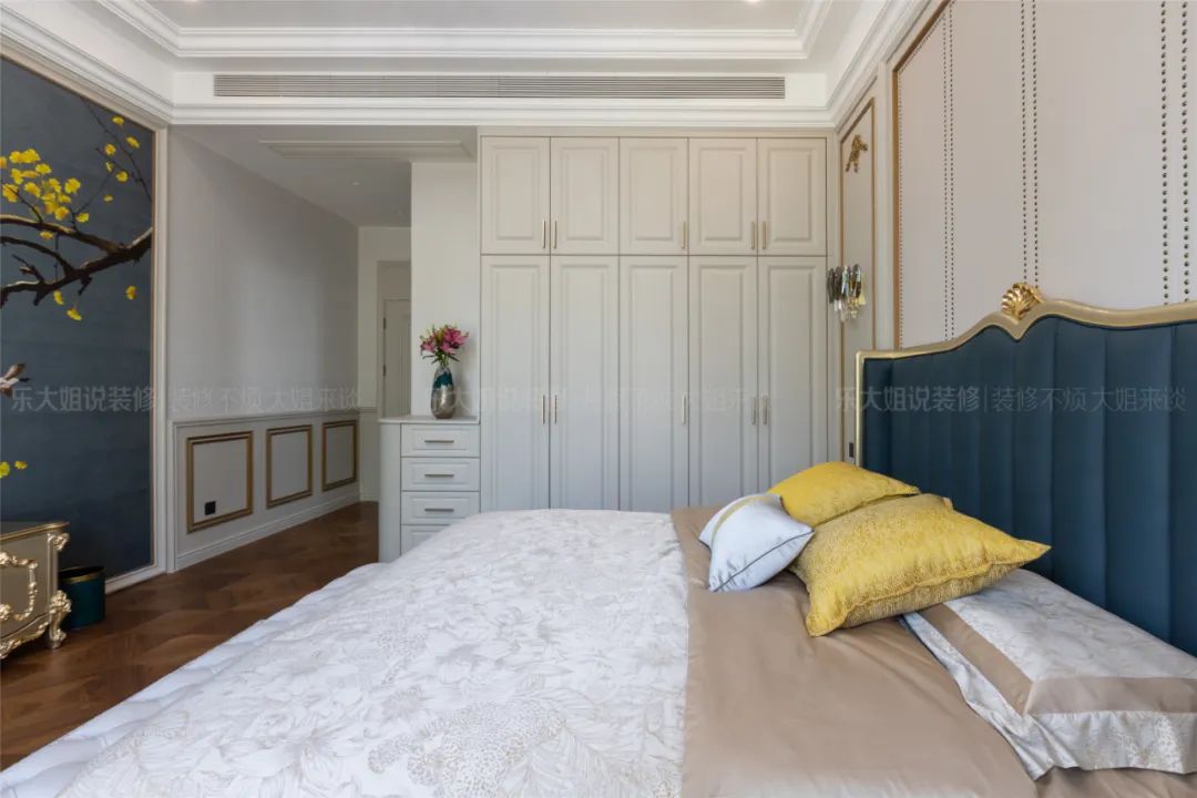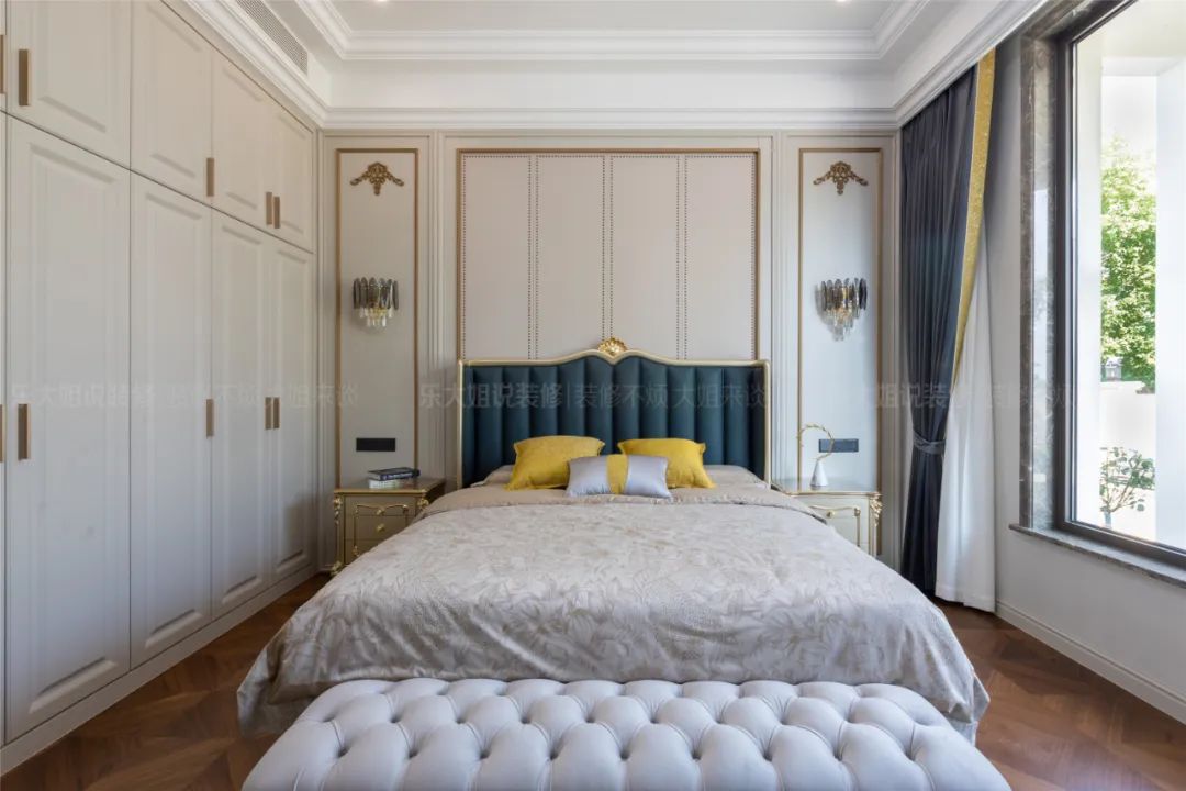 经典的铆钉、壁灯、高背床与雾霾灰定制实木护墙