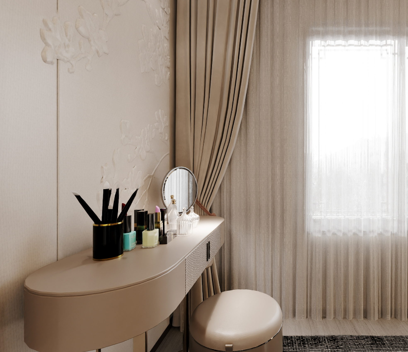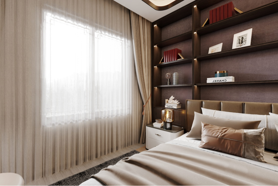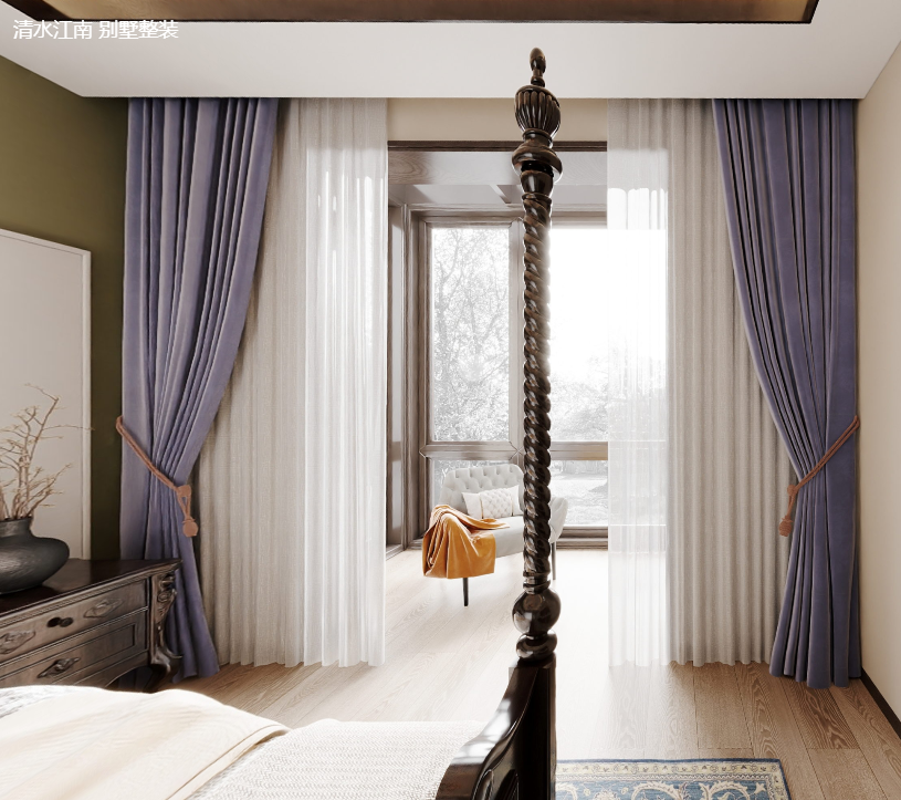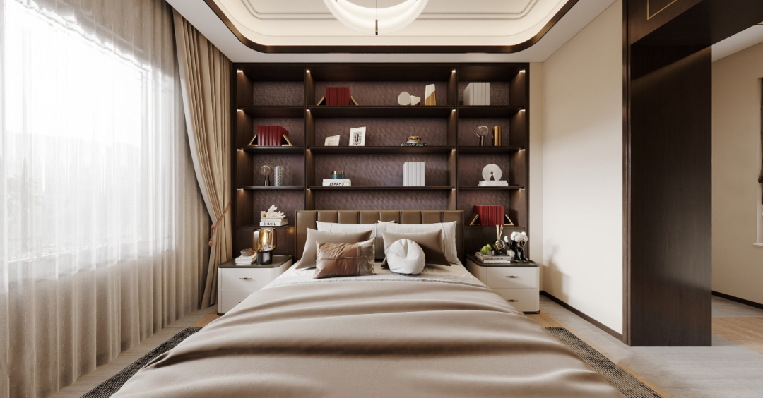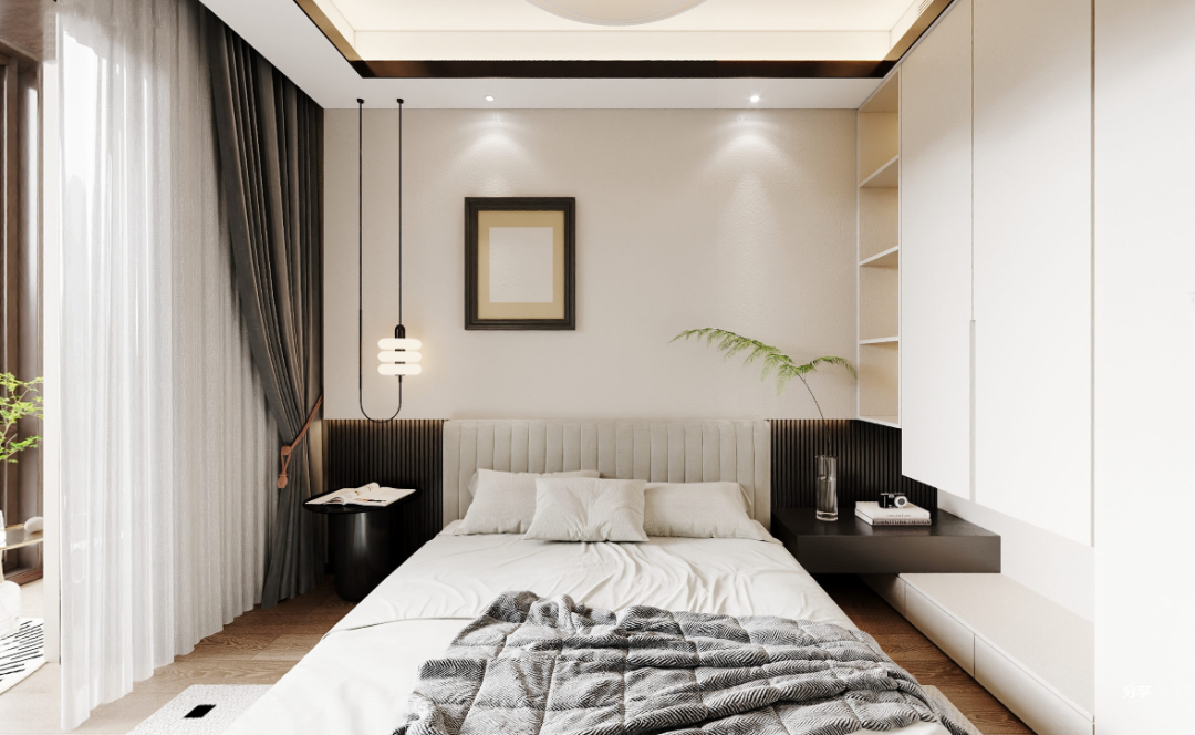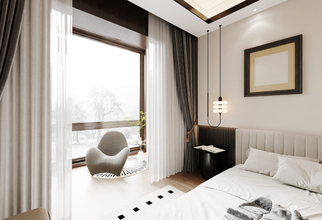 此外,搭配上业主精心挑选的功能床,深浅色的对比,进一步增强了空间的层次感,显得稳重而大气,典雅且温馨。