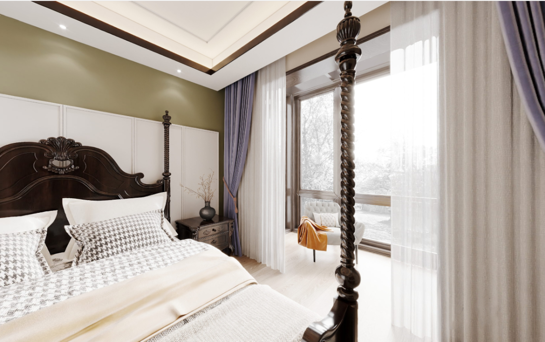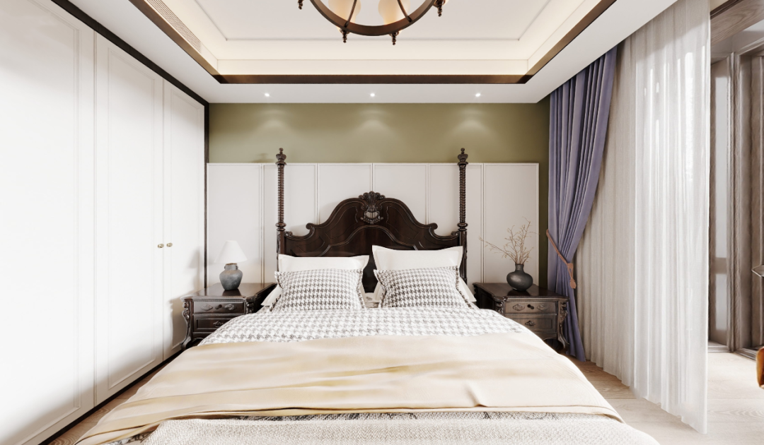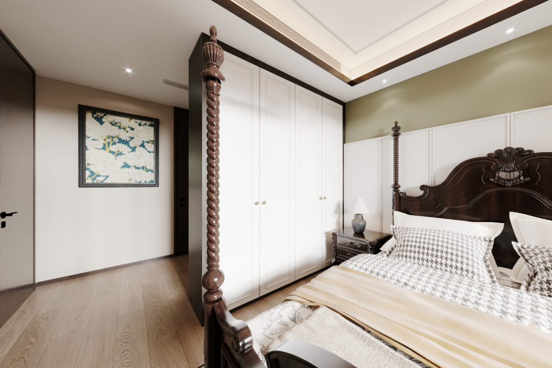 二楼总共设有两个套房,东南角的是女儿女婿的卧房。业主提出要将原有的美式家具带过来,可原房间的风格却是中式的,为此设计做了大胆而细致的改造。将原本的灰色柜门更换为白色线条勾勒的美式款,将原本沉稳的中式背景改造成优雅时尚的美式造型,从线条到元素再到色彩,全方位地打造出一个浪漫而典雅的美式卧室,让再利用的老家具得以毫无违和感地融入进来。