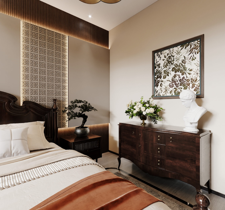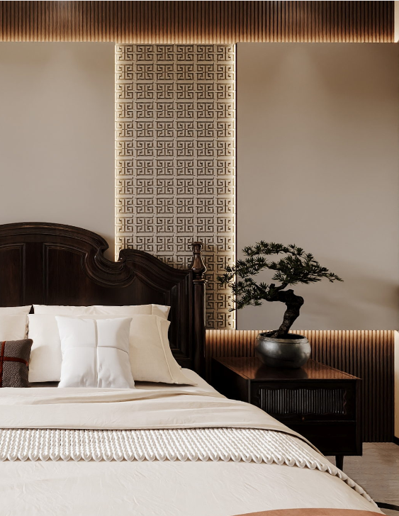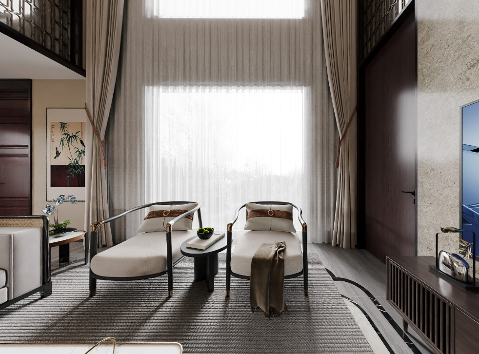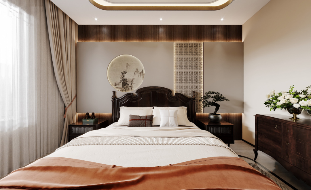 床头背景上的圆形山水造型和回字纹浮雕,营造出一种独属于东方的浪漫氛围。而高背床的设计不仅提供了额外的支撑和舒适感,也增添了一抹古典的韵味。
