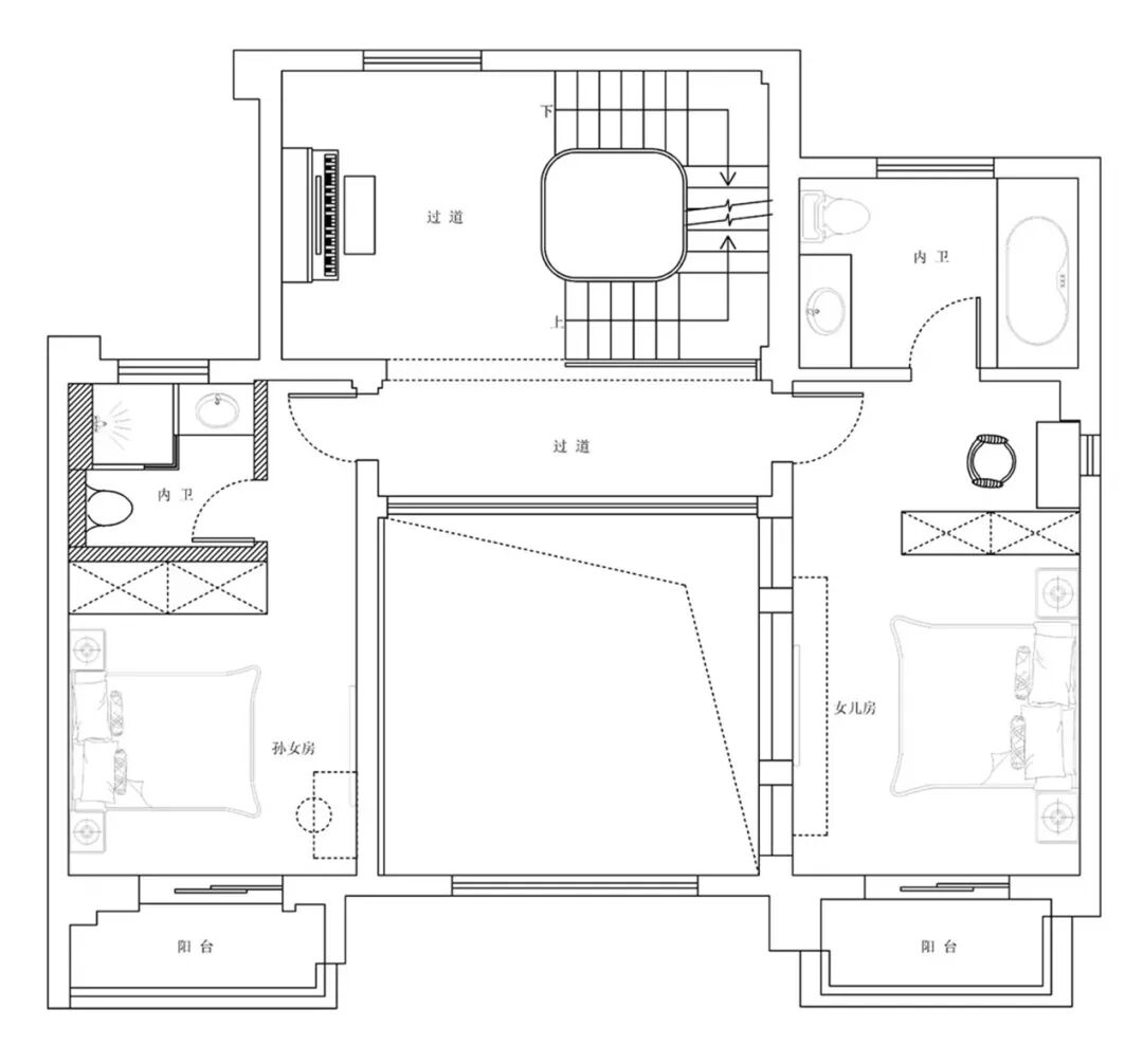 ③二楼孙女卫生间的门正对着床,比较尴尬,为此调整卫生间的布局,将开门改至过道。