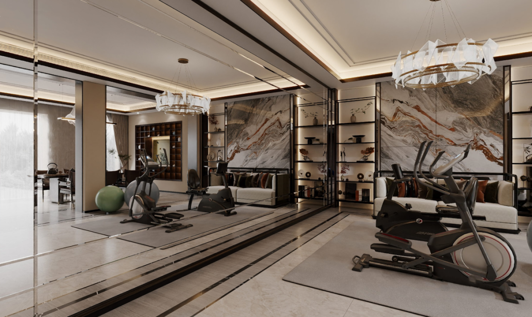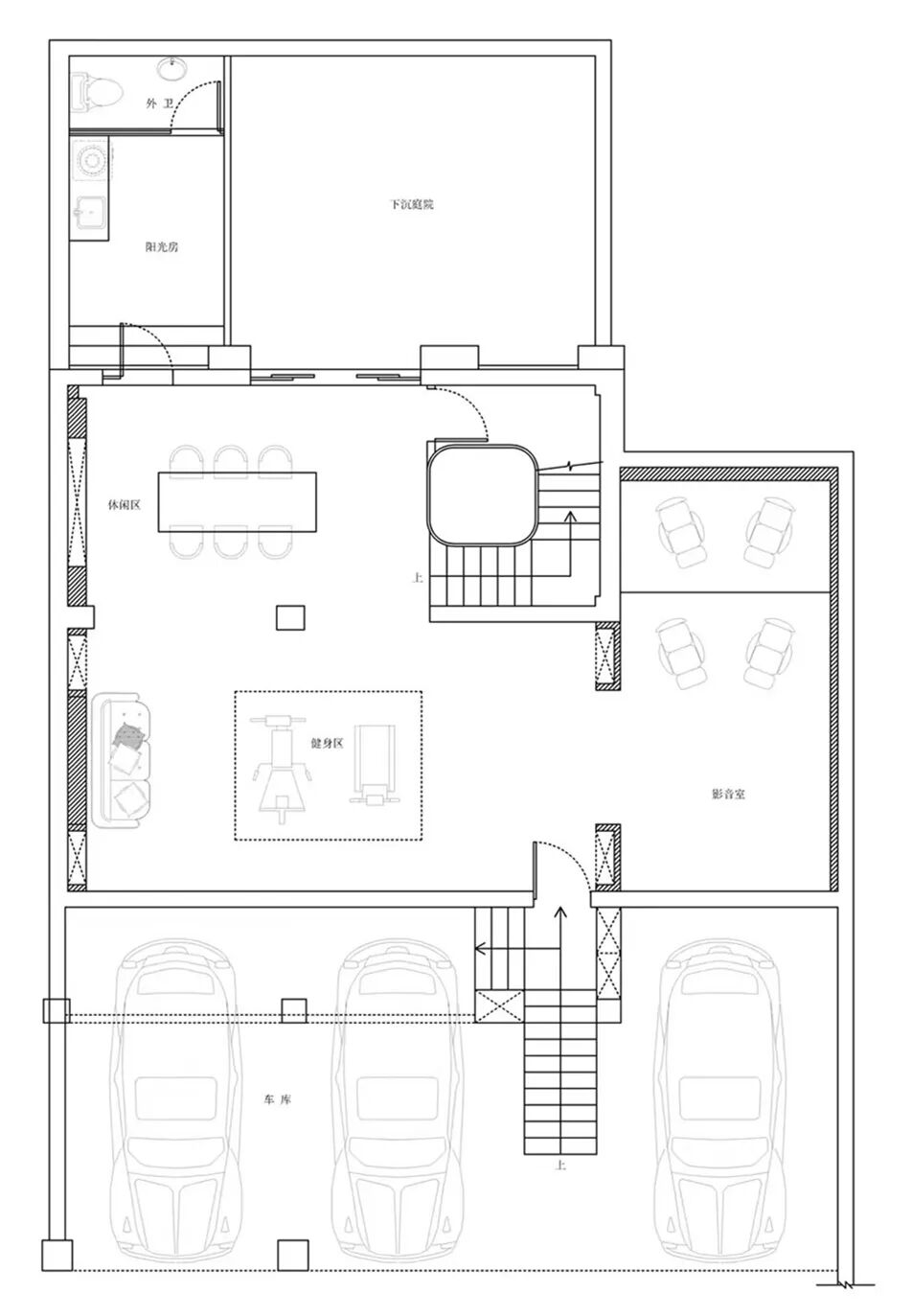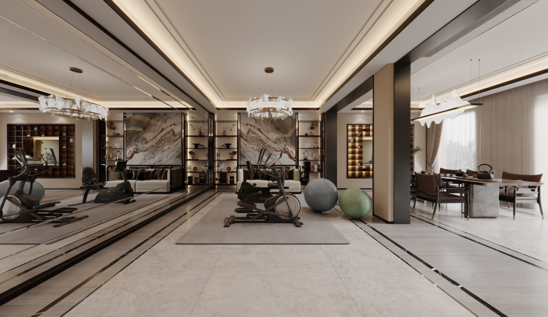 鉴于地下室原样板房装修档次不错,故基本予以保留。但考虑到地下室的空间、采光有限,将地下室进门左侧的墙体,由原来的木饰面硬包改造成一整面镜子,从而极大提升了整个空间的视觉延伸感,使地下室更为开阔明亮,也让地下休闲健身功能明确化,增加实用性。