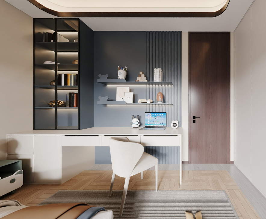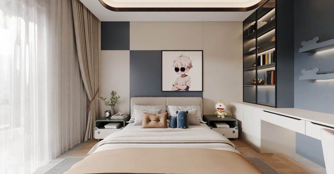 原三楼大套房的卧室区,则被规划成了孙子房。这里的风格是全新打造的,根据小朋友的年龄和喜好定制的现代风。房间内采用了蓝色与灰色的搭配,营造出既清爽又温馨的氛围。一体化的柜体设计,满足了多样化的功能需求。
