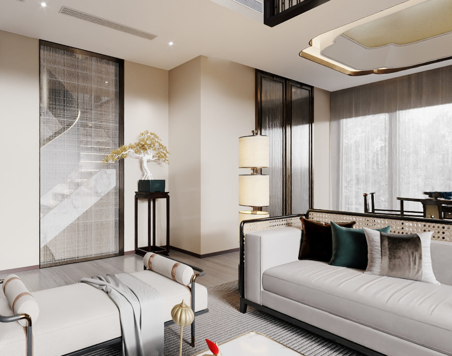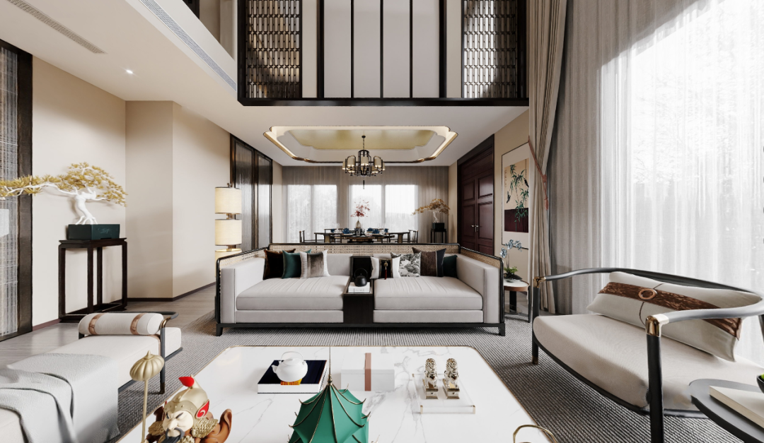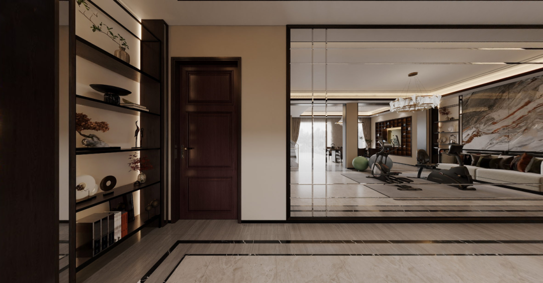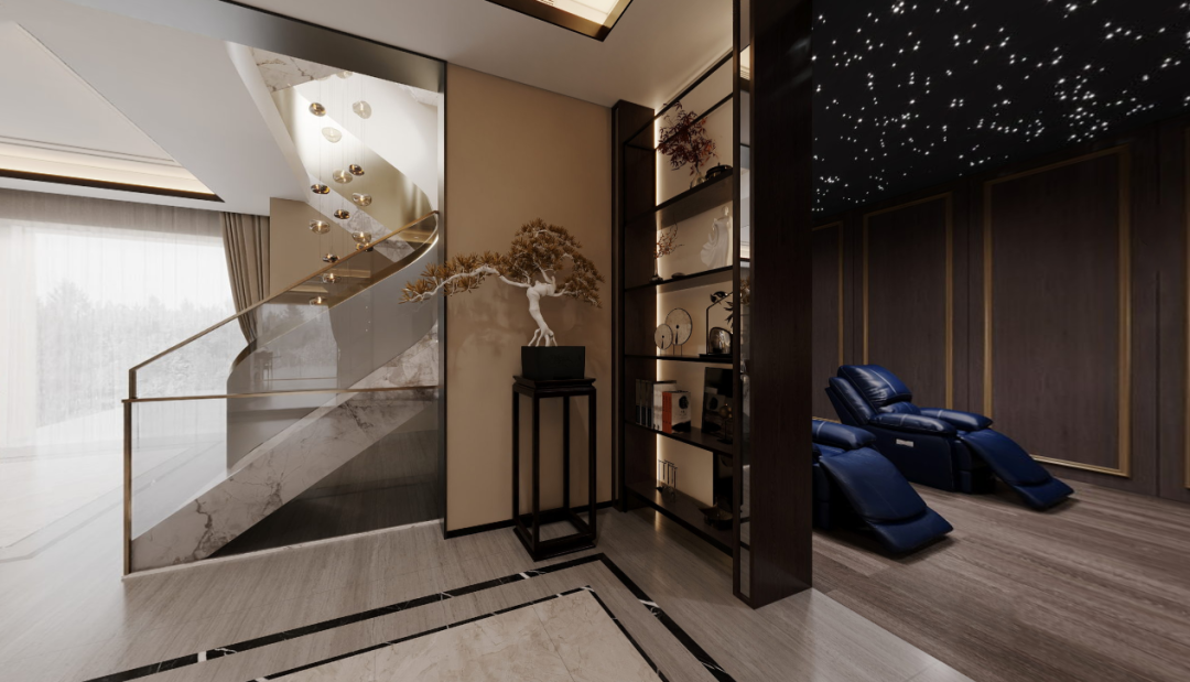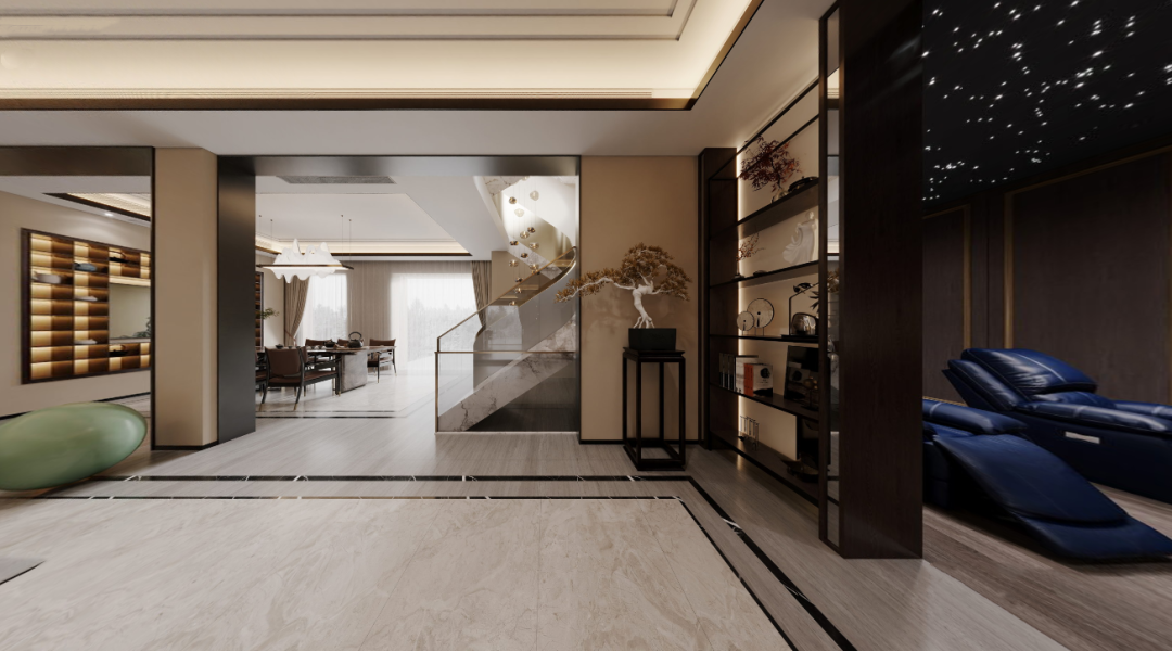 这里,是地下入户后的第一视角。首先映入眼帘的是改造后的旋转楼梯,其优雅的弧线、通透的结构以及垂落而下的灯饰,共同构成了一幅极具美感的画面,动人心弦,成为整个空间的焦点。中式端景,以其宁静而雅致的造型迎接着每一位来客,让人在踏入这个空间的瞬间,就能感受到一种东方的宁静与和谐。