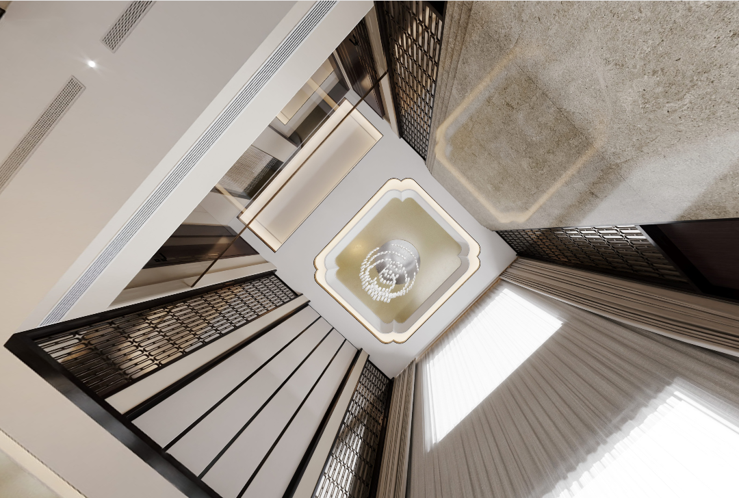 取消环抱式电梯,改为旋转式楼梯设计,减弱拥堵感的同时,更具美感;