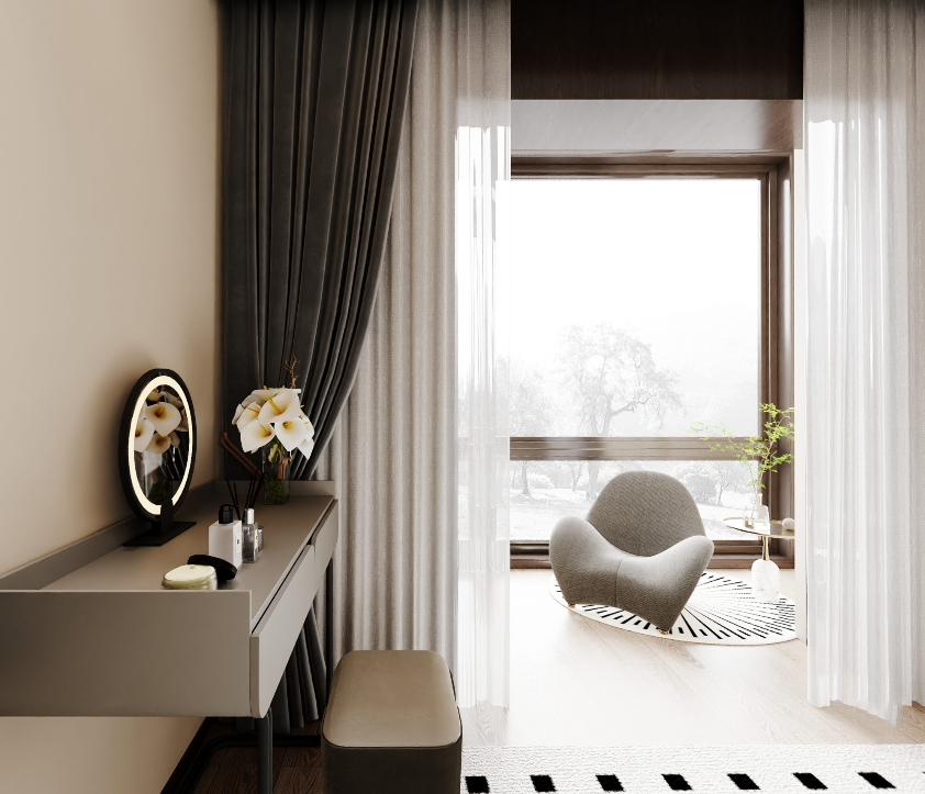一楼的卧室,是给老太太准备的备用卧房。临时乏了或以后年纪大了,就可在此休憩。相对于三楼,这里更具诗意柔情。