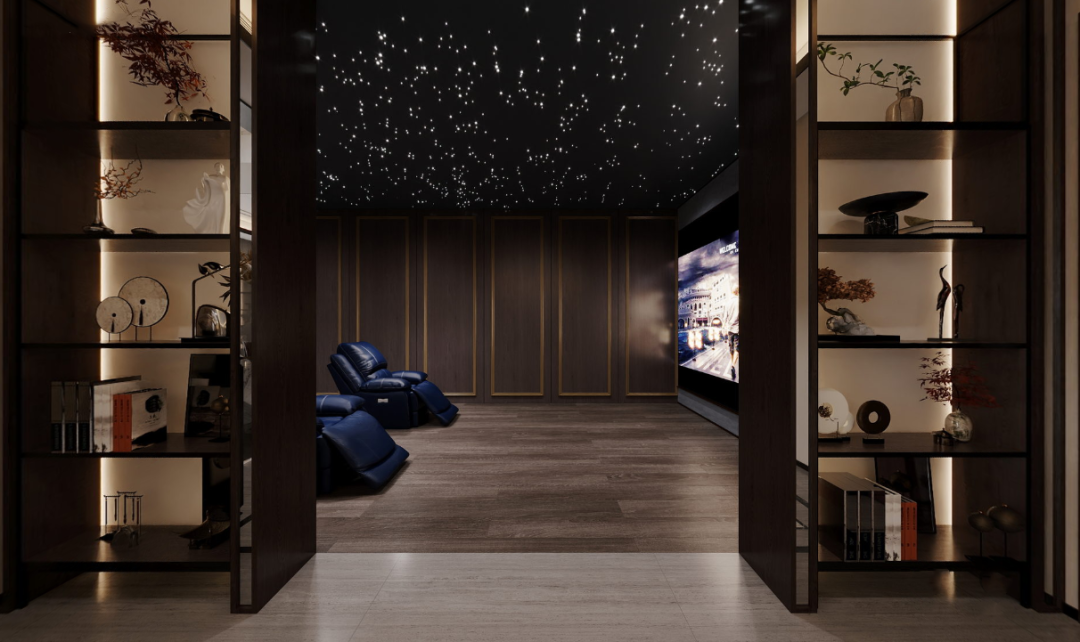 影音室里,响应业主对星空氛围的向往,特别在天花板上增加了星空顶的装饰,如此不止增强了观影时的沉浸感,更让人仿佛置身于繁星点缀的夜空之下,享受着非凡的观影体验。