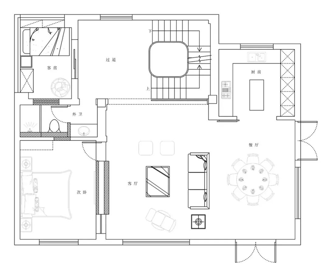 ②考虑到一楼仅次卧有一个卫生间,将其改造为外卫,以提高空间的利用率和便利性。