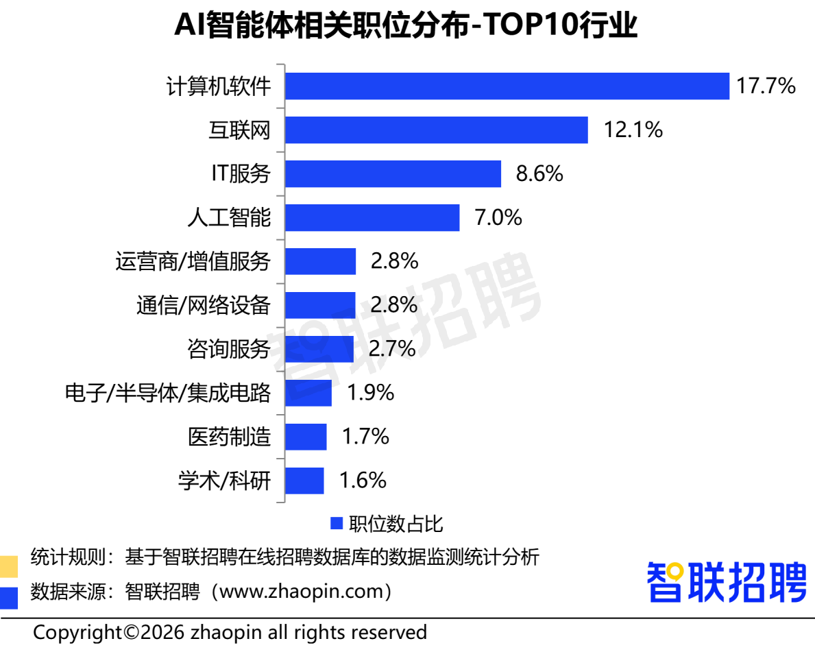 从行业分布看,AI智能体相关人才需求主要分布在新一代信息技术行业。智联招聘春节后前三周的数据显示,计算机软件行业以17.7%的职位数占比位居榜首,互联网(12.1%)、IT服务(8.6%)、人工智能(7.0%)行业紧随其后。