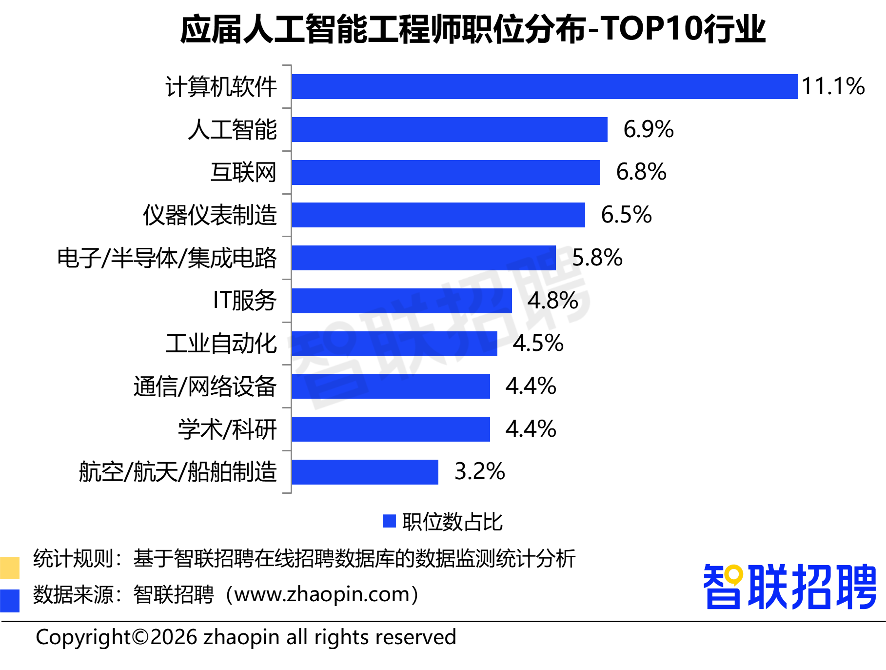对于应届生而言,AI领域的机遇不仅体现在需求增速上,更体现在多元的行业选择上,多个行业的人工智能岗位持续向应届生敞开大门。具体来看,计算机软件行业以11.1%的占比位居首位,成为AI应届生的最大需求方。人工智能行业以6.9%的职位数占比位列第二,互联网(6.8%)、仪器仪表制造(6.5%)、电子/半导体/集成电路(5.8%)、IT服务(4.8%)等科技、制造行业紧随其后。此外,工业自动化、通信/网络设备、学术/科研、航空/航天/船舶制造等领域也均释放出AI应届生招聘需求,进一步拓宽了应届生的就业选择范围。