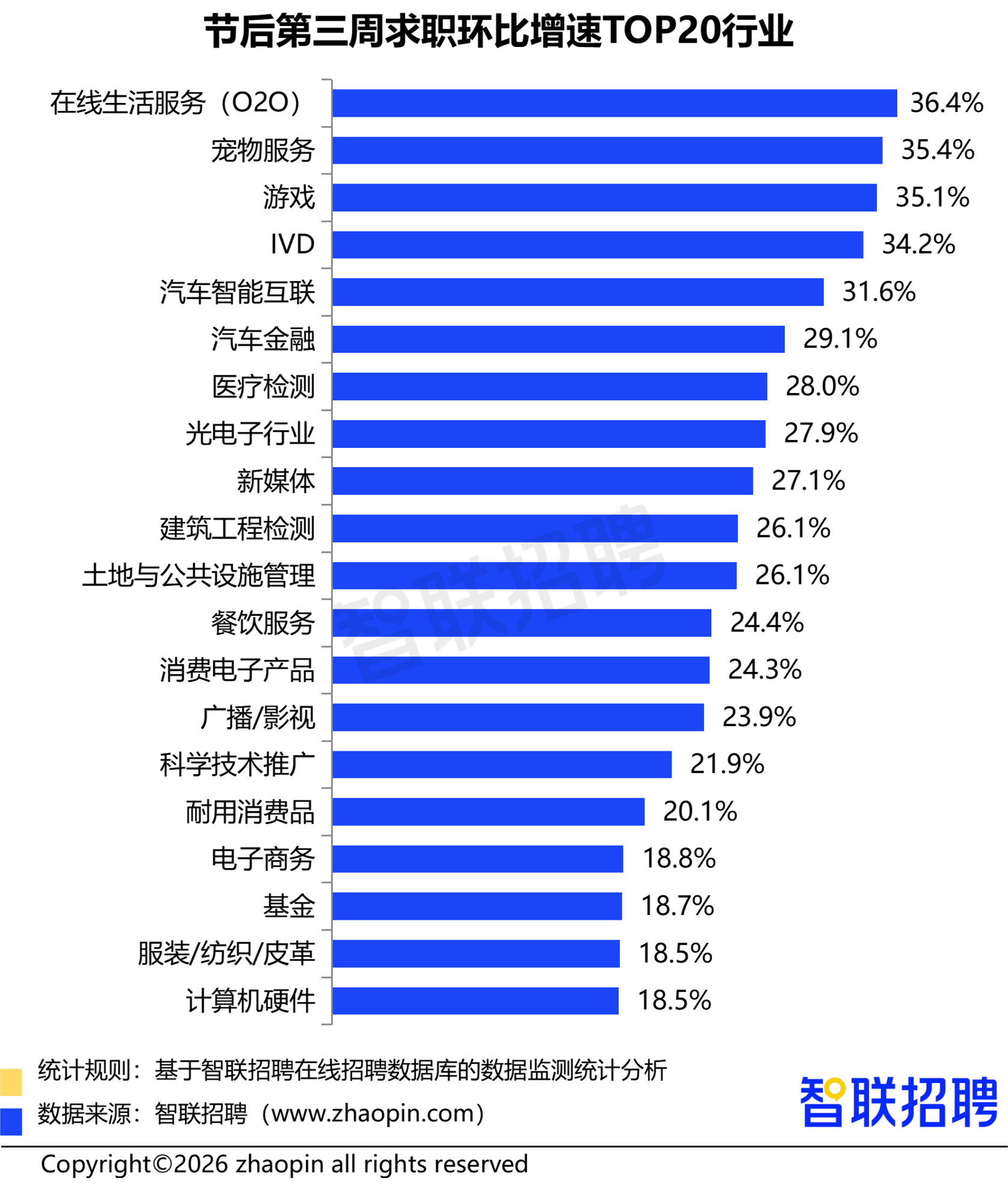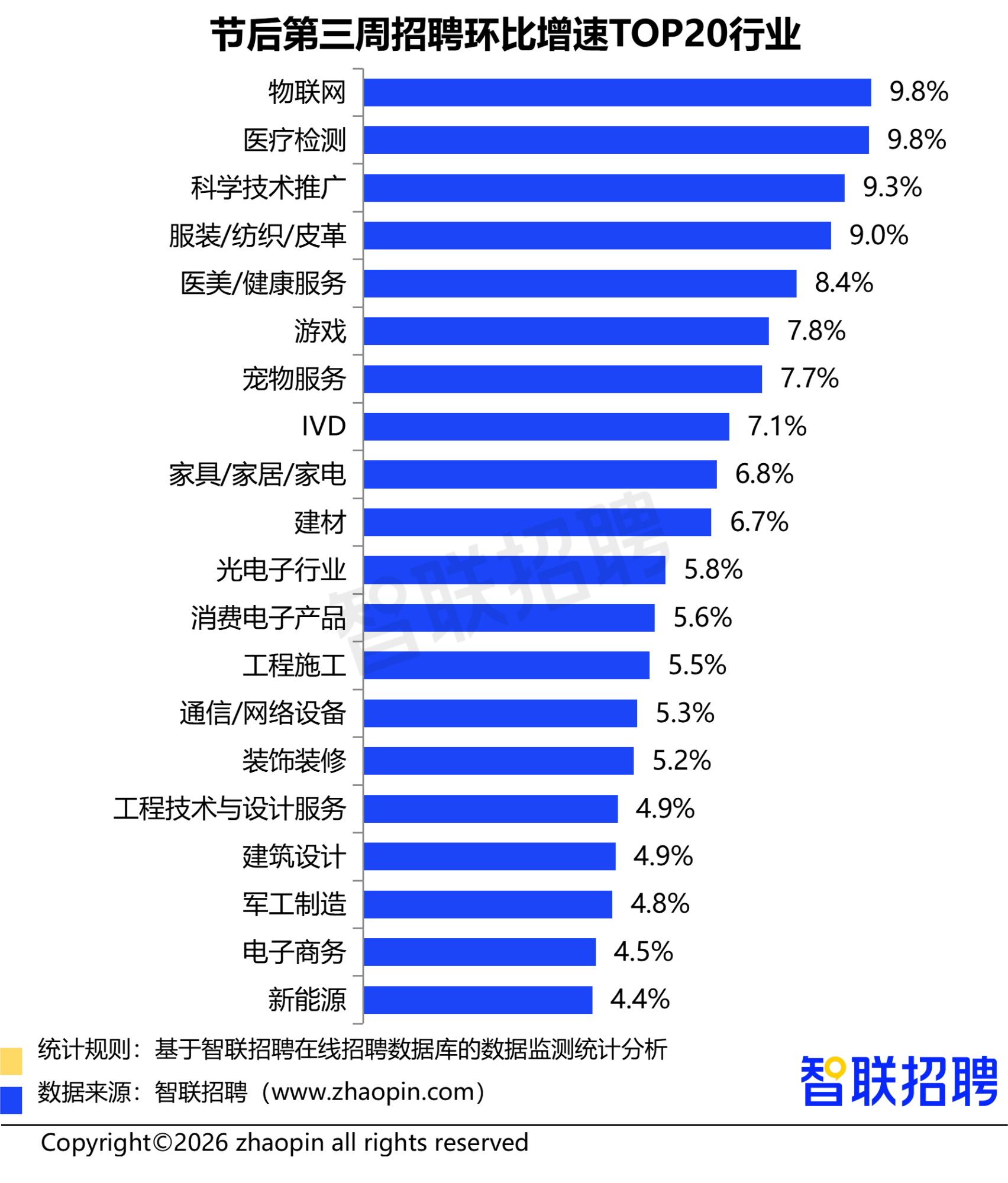 与此同时,服务消费领域同样表现活跃:医美/健康服务(8.4%)、游戏(7.8%)、宠物服务(7.7%)等行业均跻身前十,反映出节后居民消费回暖、服务需求释放对就业的直接拉动。