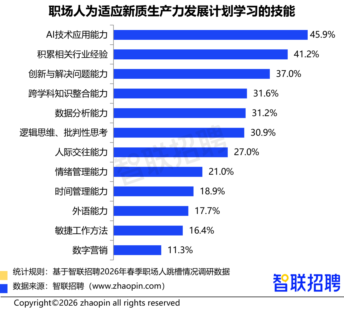 46.4%职场人认为新质生产力领域的门槛可跨越,AI技术应用能力成进修首选