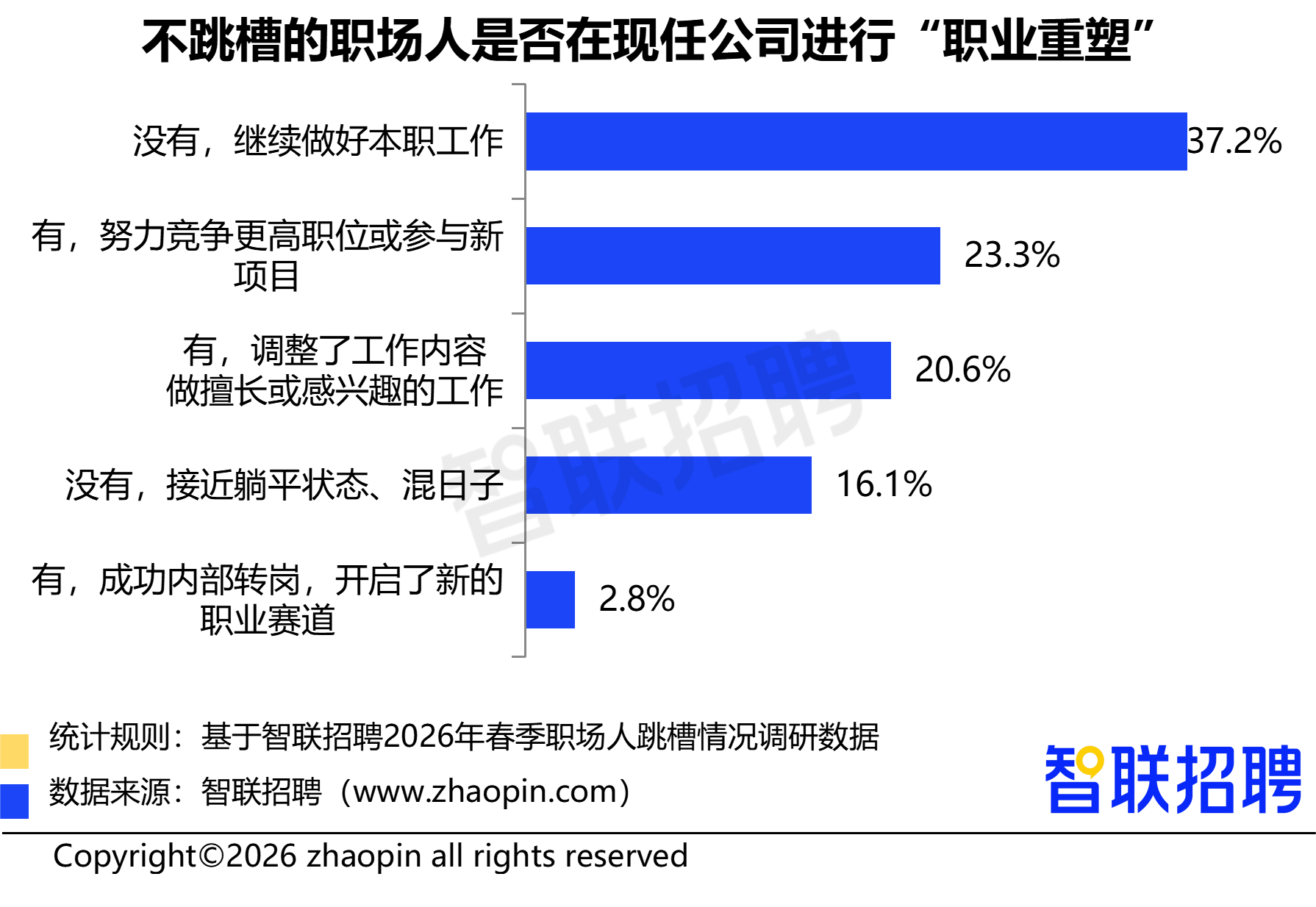 但是,即使不选择跳槽,职场人也在积极寻求职业发展突破。有46.7%的职场人选择在不跳槽的情况下进行不同程度的"职业重塑"。其中,23.3%会"努力竞争更高职位或参与新项目",20.6%会"调整工作内容,做擅长或感兴趣的工作",还有2.8%已"成功内部转岗,开启了新的职业赛道"。这一数据表明,一部分职场人意识到职业发展不一定要通过跳槽来实现,在现有企业或岗位上同样可以通过自我提升、岗位调整来获得成长。