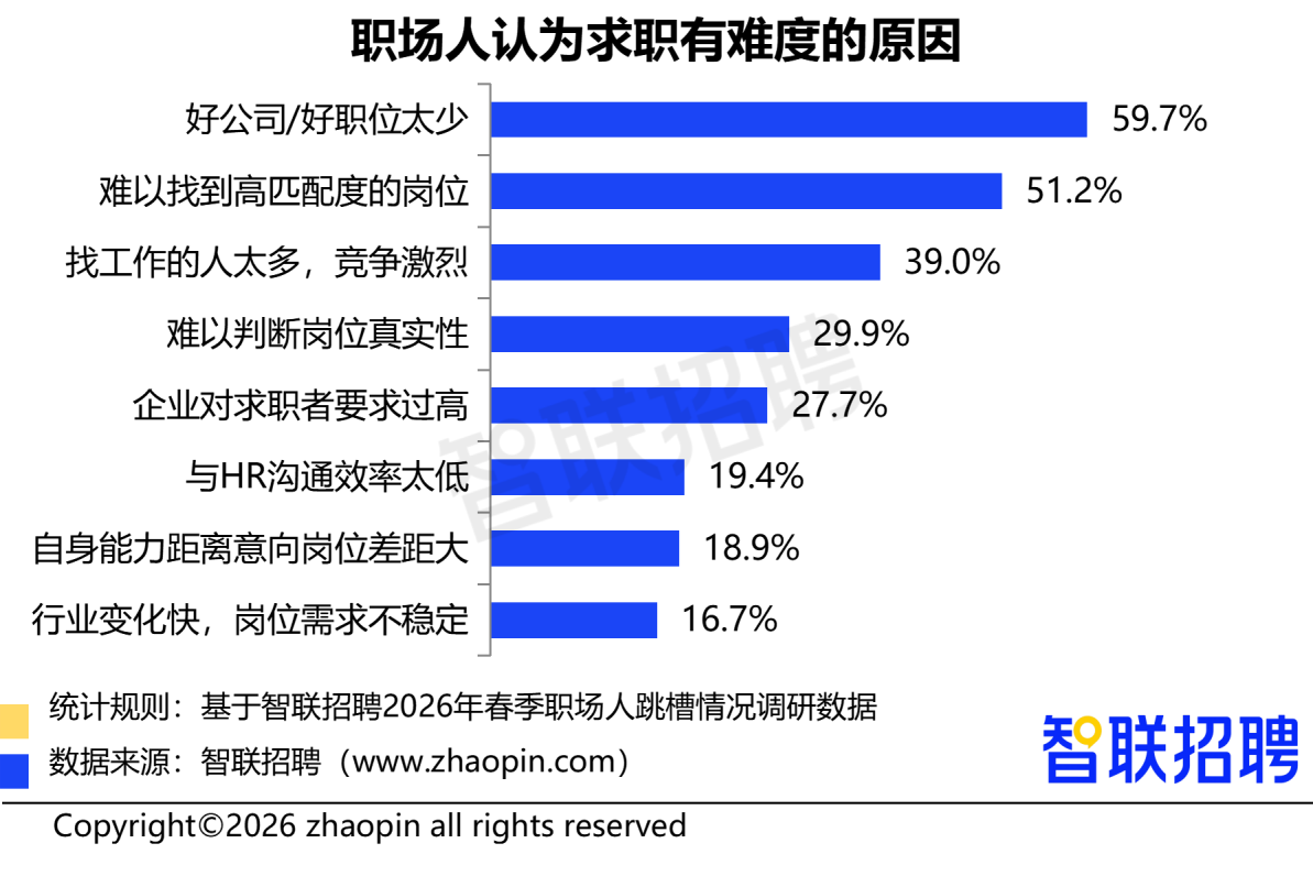 59.7%的职场人认为求职有难度的原因是"好公司/好职位太少",51.2%是因为"难以找到高匹配度的岗位",39%则将原因归咎为"找工作的人太多,竞争激烈",与去年基本一致。